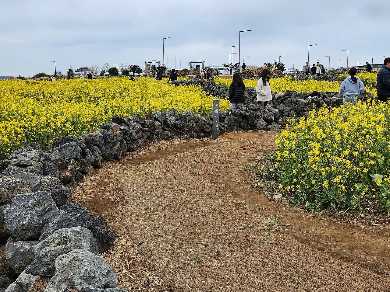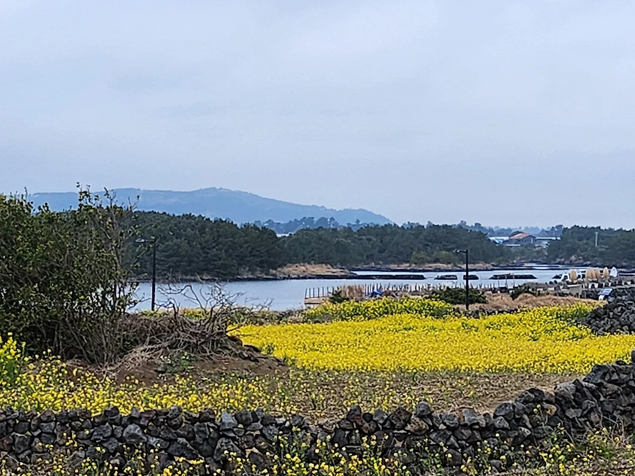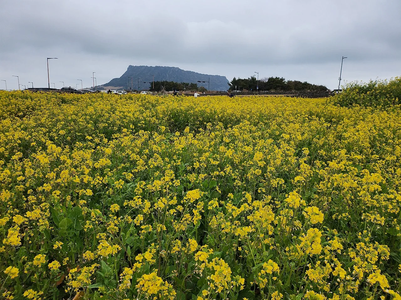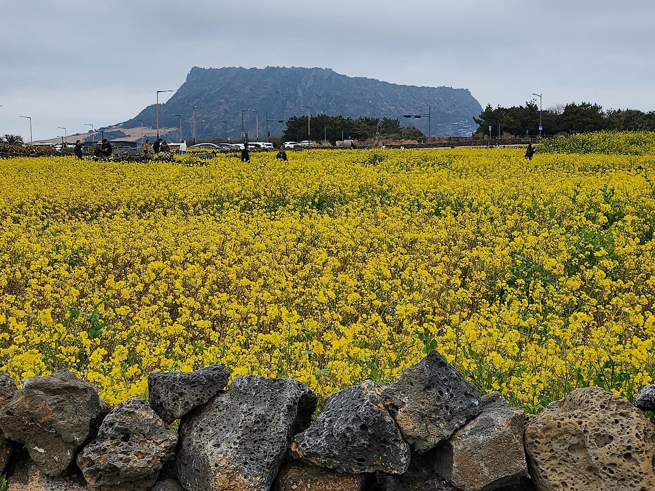 성산일출봉과 돌담을 배경으로 한 유채꽃밭은 과연 장관이었어요.