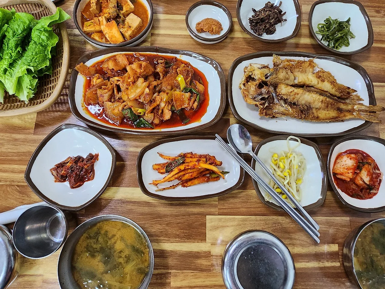 고성 시내 복판길 굽이돌아 예약된 식당에 들어가자마자 잘 차려진 정식을 거의 허겁지겁 폭풍흡입했네요.