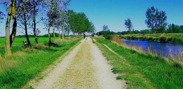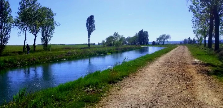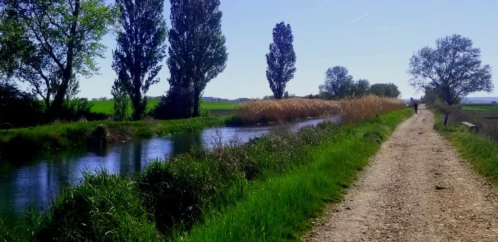 끝 모를 평원과 낮은 구릉으로 이어지는 지루한 카미노 여정에 점점 지쳐갈 즈음. 짜안~하면서 비장의 카드를 선보여 분위기를 쇄신시키곤 한 카미노 길이다. 그 기대를 이번에도 져버리지 않았다. 워낙 단조롭고 황막한 지형이라 전혀 기대치 않은 의외의 풍경, 신기루처럼 대형 운하가 나타났다. 잠깐 스치는 정도가 아닌, 운하가 그것도 5㎞ 정도 뻗어있어 놀멍쉬멍 두 시간쯤 물길 따라 걸었다. 빨아 당길 듯 짙은 물빛이라 적당한 거리 둔 채 줄곧 운하와 동행했다. 물가로 바짝 다가서기 겁날 만큼 급류인 데다 물살은 세찼다. 도로 높이에 거의 차오를 정도의 풍부한 수량을 품고 운하는 묵직이 흘러갔다. 차고 거친 물바람이 미루나무 둥치를 좌우로 흔들었다. 수면에 물비늘이 무수히 일렁였다.