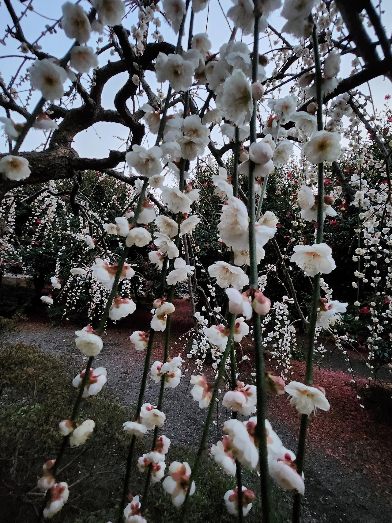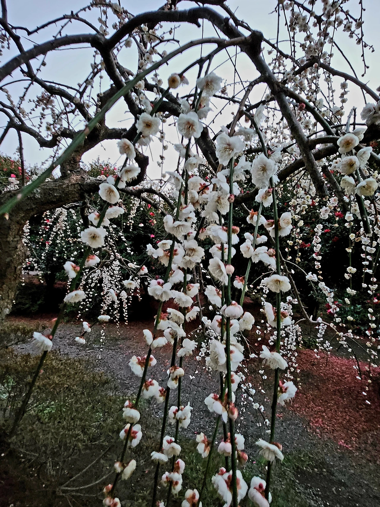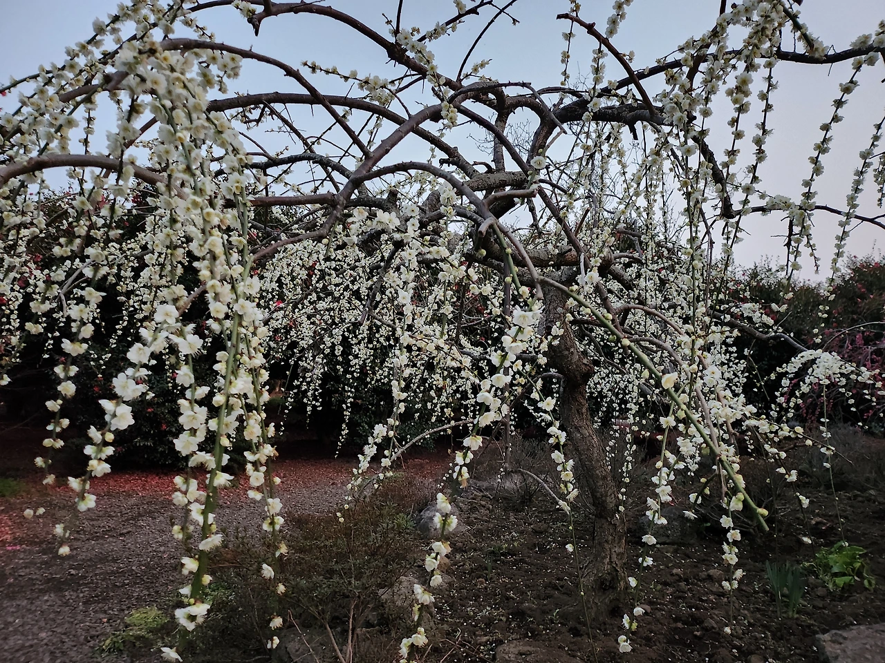 야리야리한 버들가지처럼 낭창거리진 않지만 아래로 죽죽 흘러내린 줄기에 다문다문 핀 매화.
