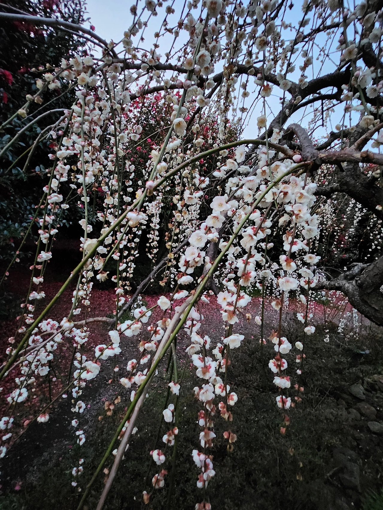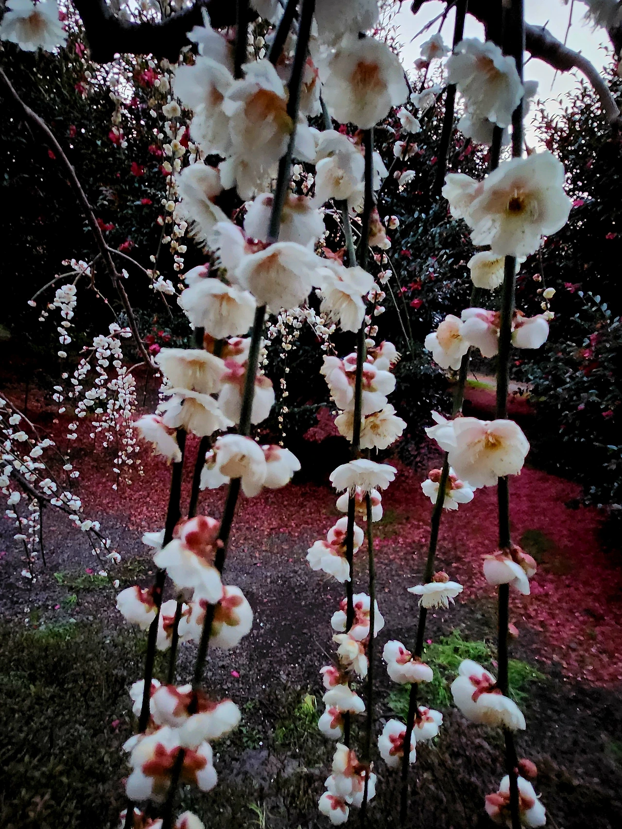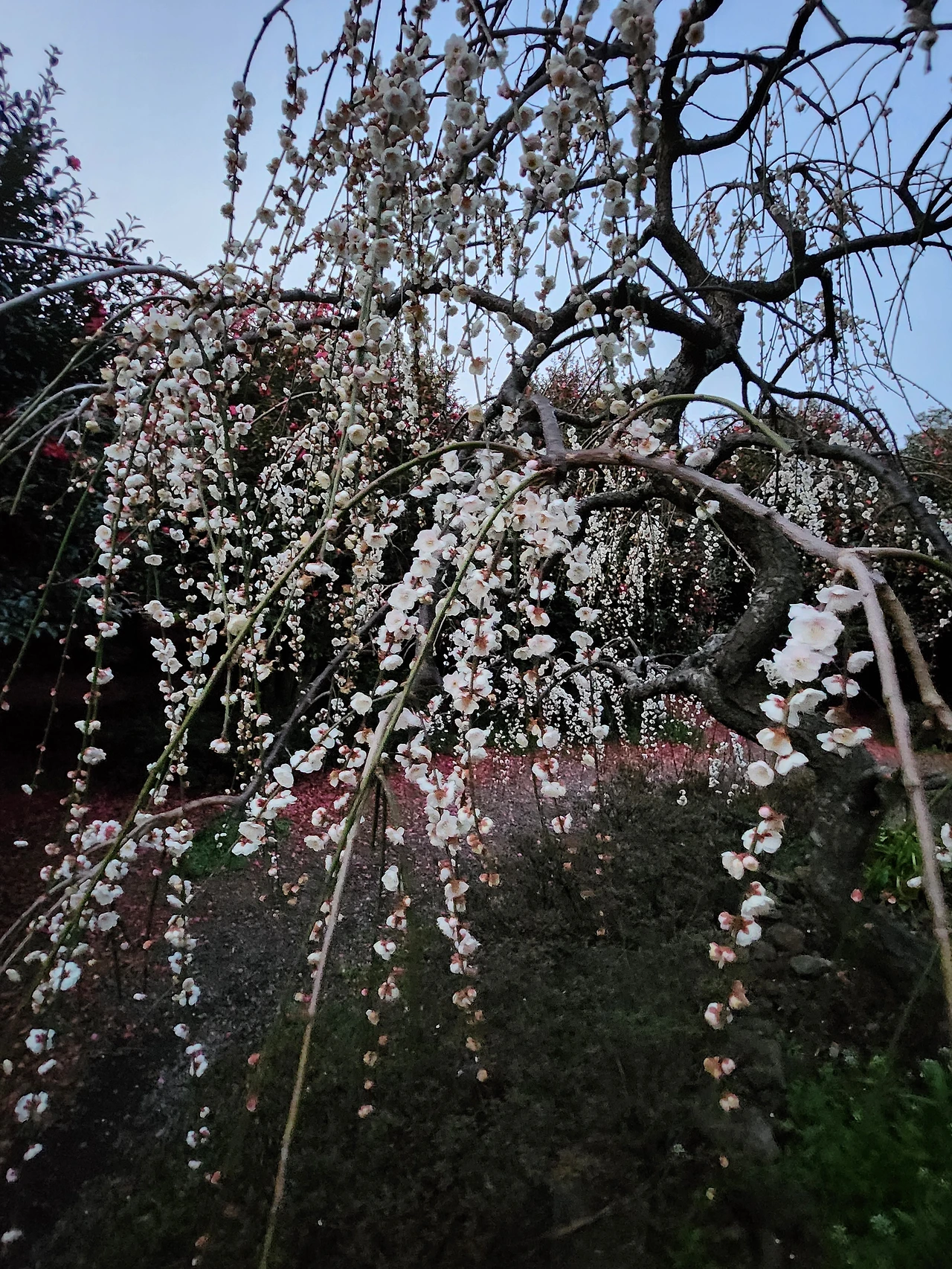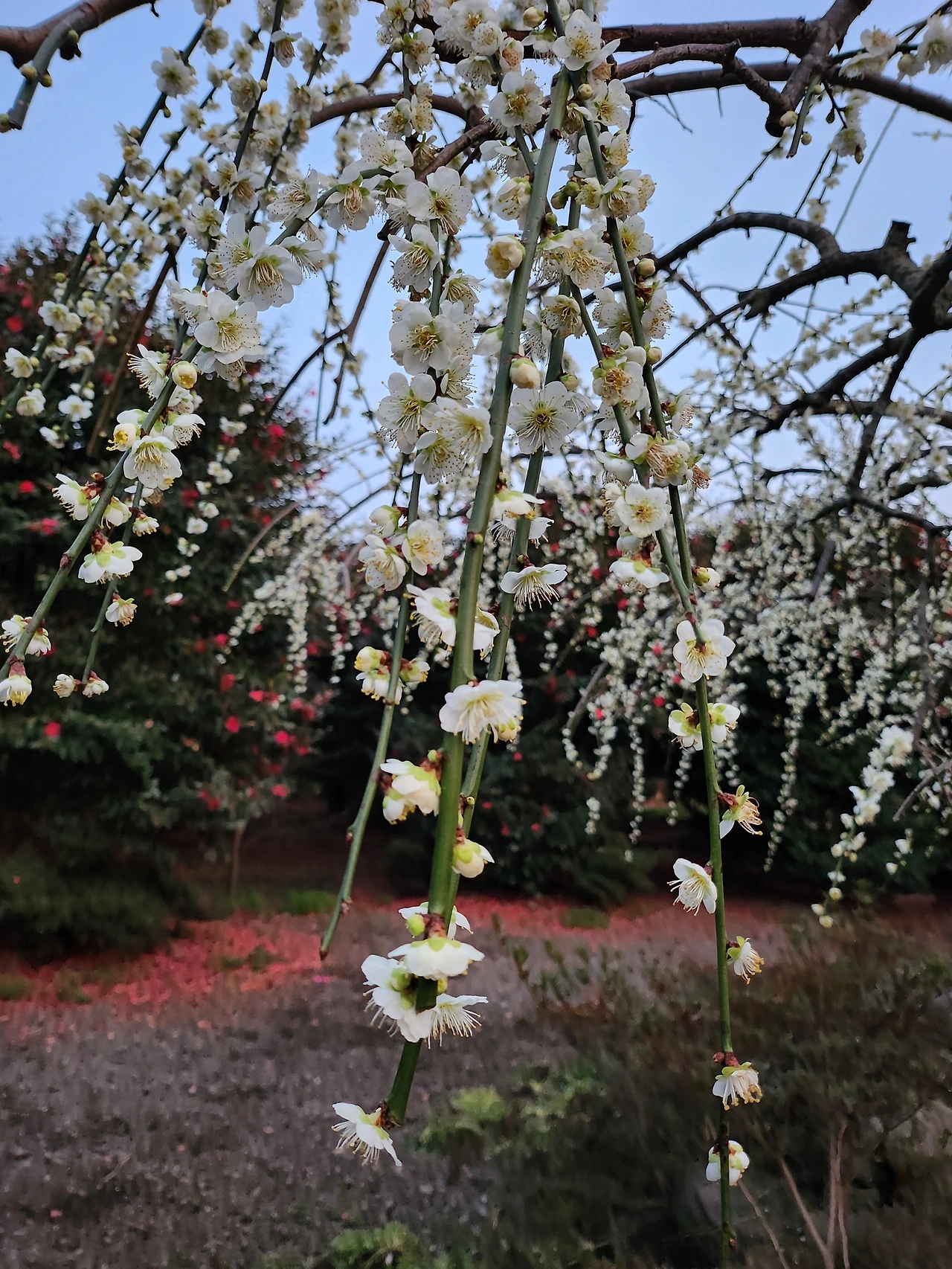 야리야리한 버들가지처럼 낭창거리진 않지만 아래로 죽죽 흘러내린 줄기에 다문다문 핀 매화.