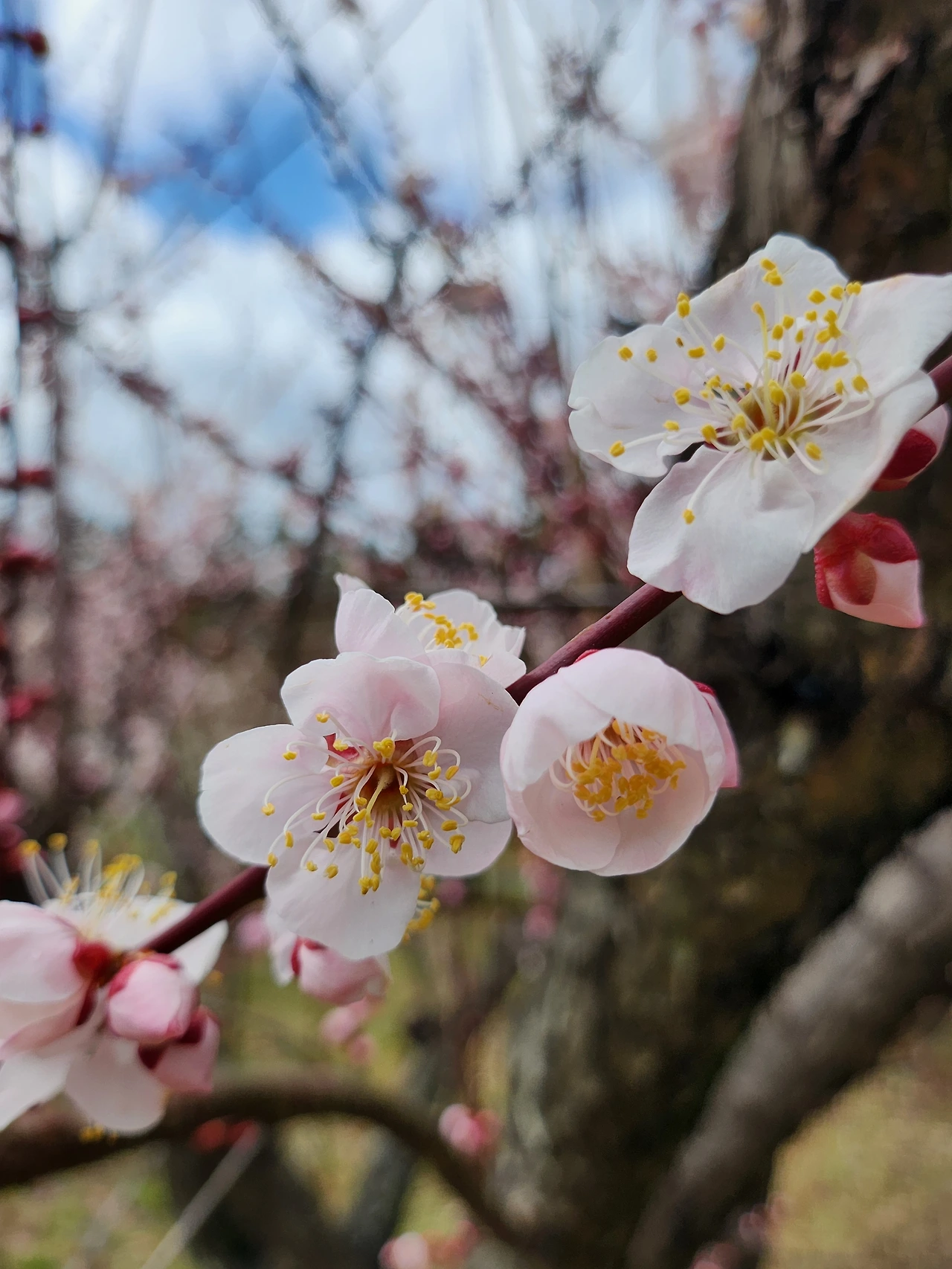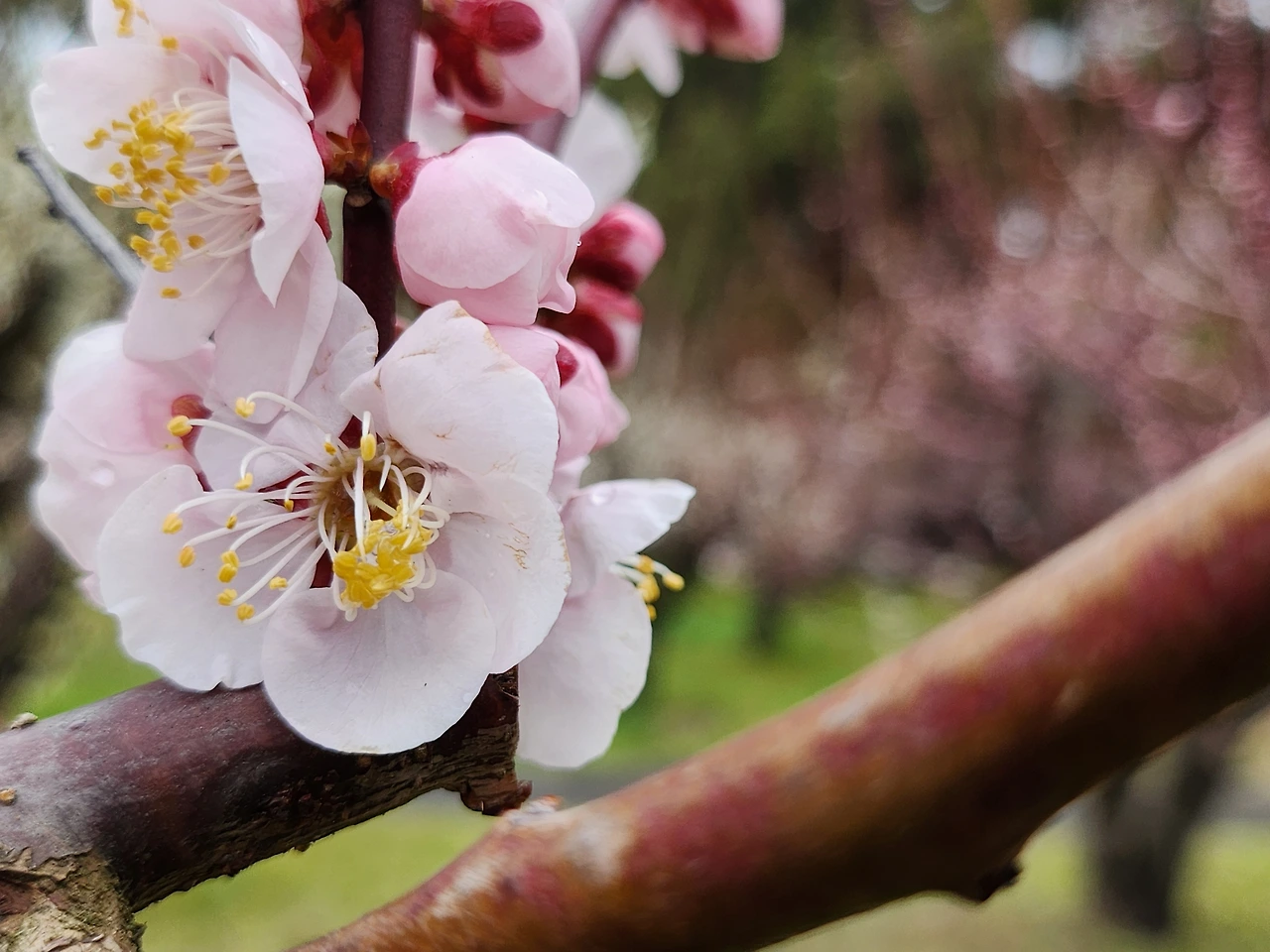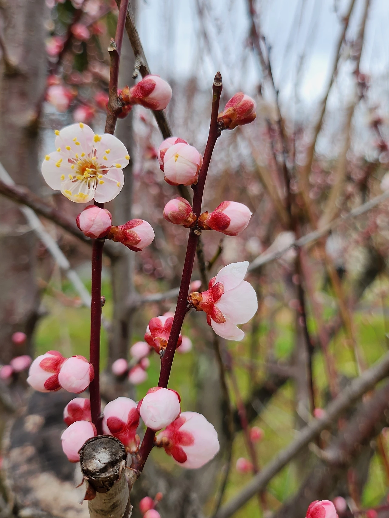 꽃자루가 긴 벚꽃과 달리 매화와 살구꽃은 가지에 딱 붙어서 핀답니다.