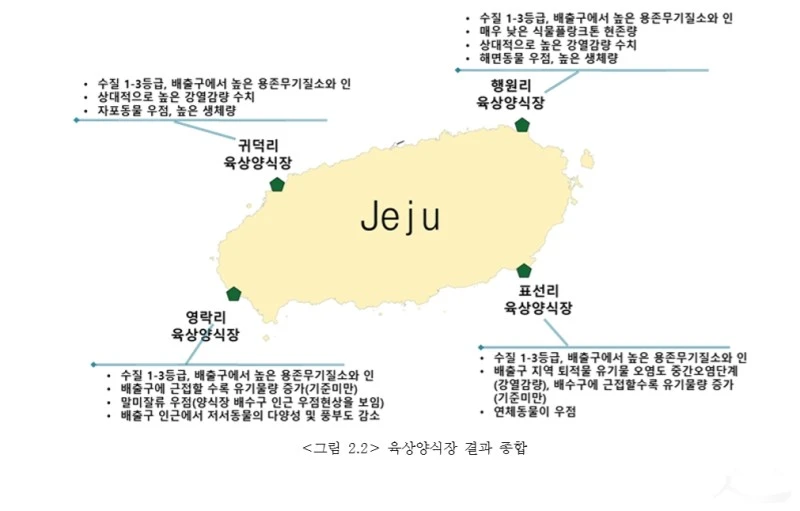 총 해안선 길이 254km인 제주에는 500여 곳의 양식장이 난립돼 있다. 특히 서귀포시 관내에는 육상 양식장이 우후죽순처럼 불어나 성업 중이다. 표선리 양식장 배출수는 주변 다른 해역보다 용존 무기질소 16배, 용존 무기인 20배, 화학적산소요구량이 5배 이상 각각 높게 나타났다. 양식장 배출수 인근 해역에는 불가사리류, 말미잘류, 구멍갈파래 등 해적생물만이 높은 서식밀도를 보이며 바다 생태계를 크게 위협하고 있었다.