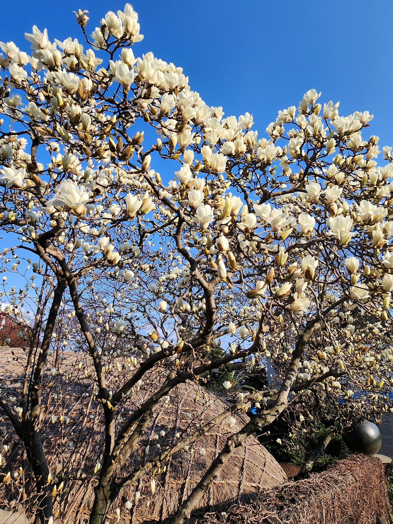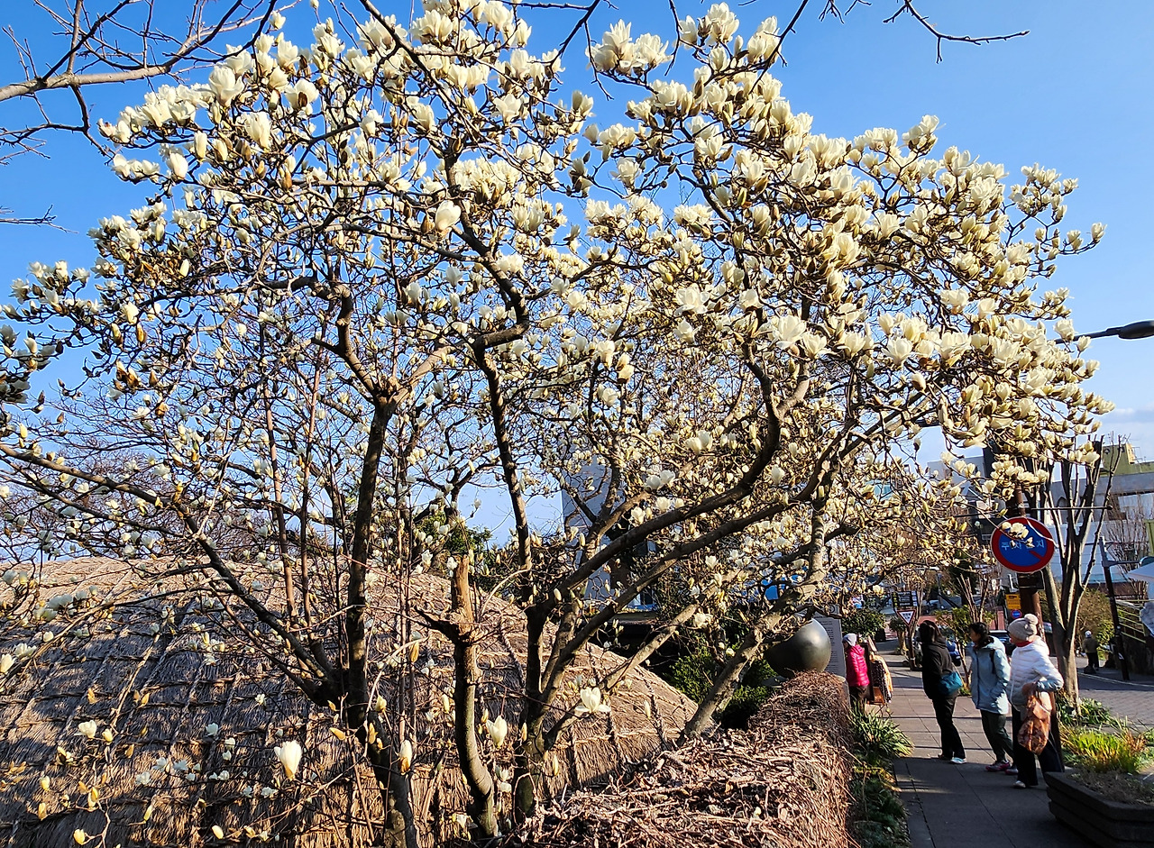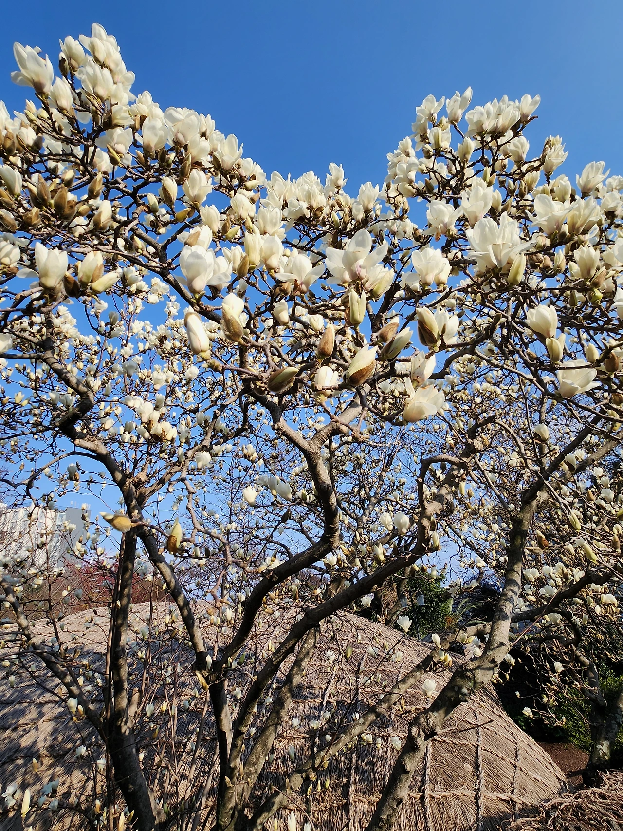 꽃등불 하얗게 밝힌 목련이 어쩐지 초가로 이은 납작한 지붕과 언밸런스하긴 하지만.