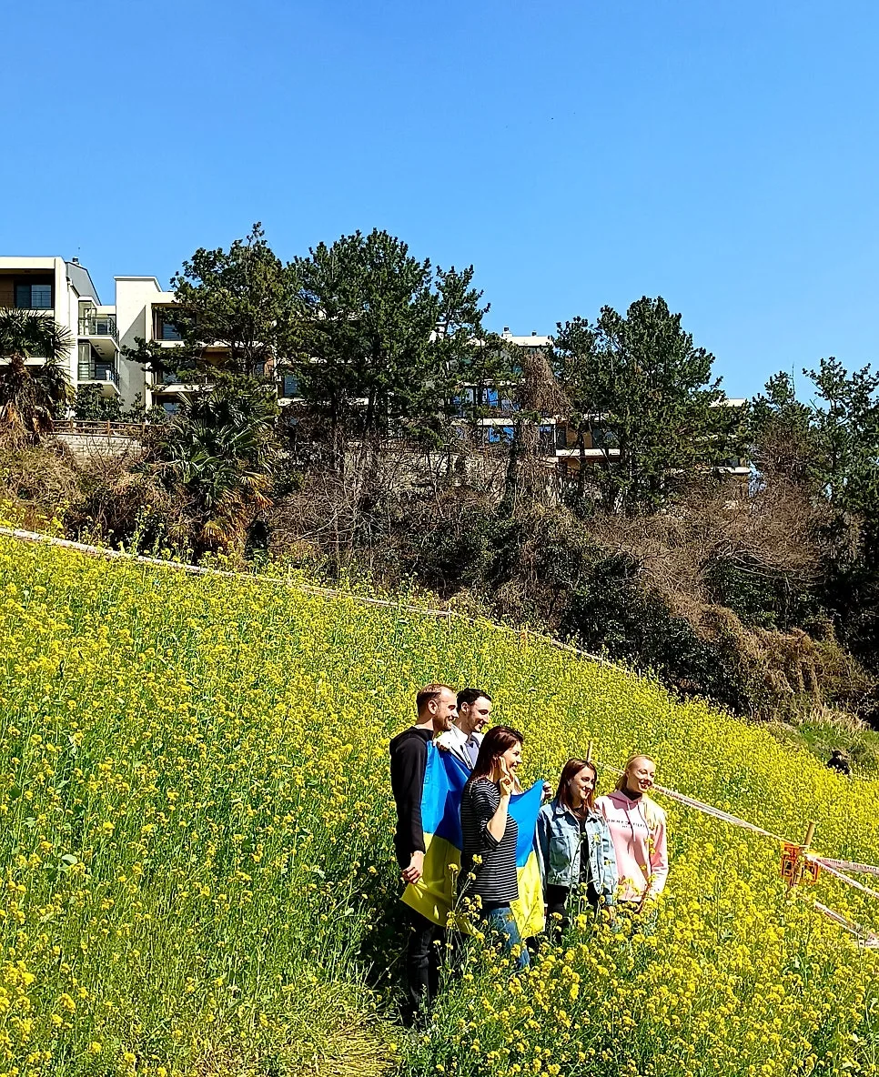 유채꽃 속에서 그들도 포즈를 잡고 밝은 표정으로 사진을 찍었다.