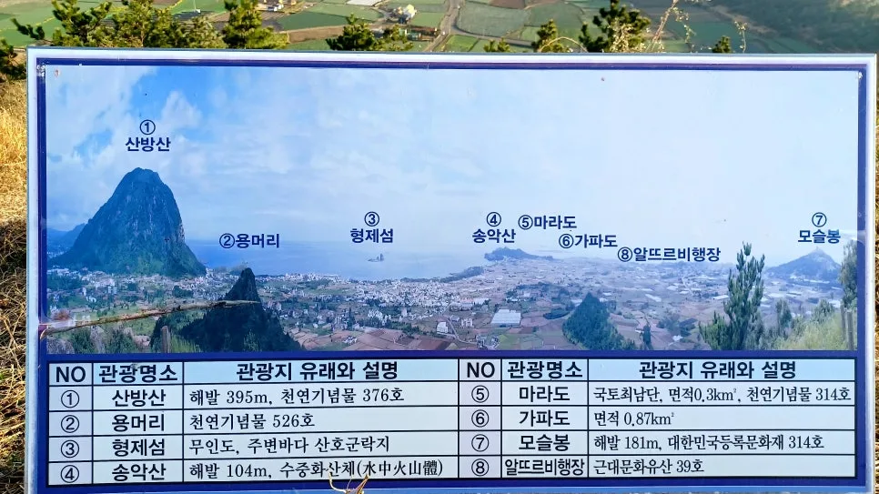 날씨가 받쳐주는 날 정상에 서면 마라도와 가파도가 선명히 보이고 한라산 자태 또렷 보이고도 남으리라.