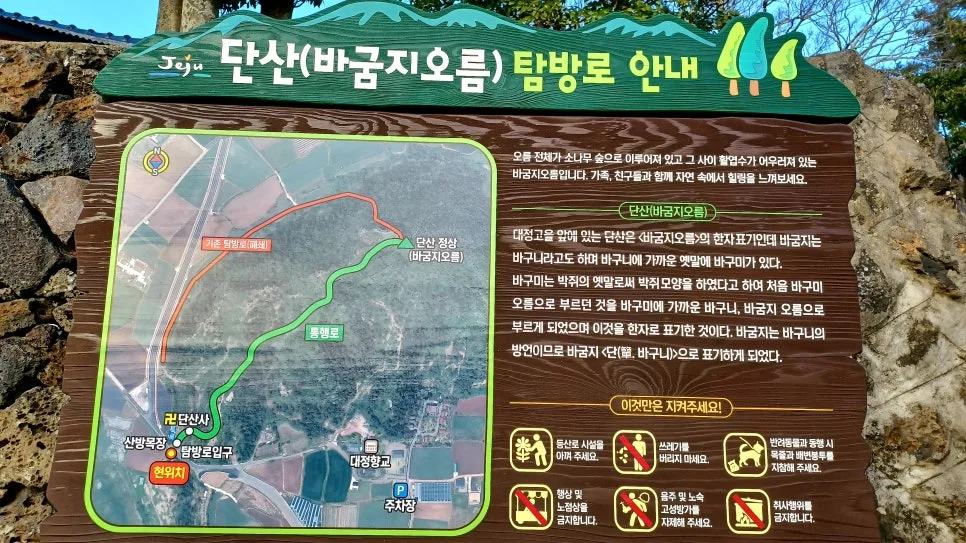 바굼지오름 또는 박쥐오름 혹은 단산이라 불리는 이 오름은 산방산 옆에 위치한 기묘하게 생긴 바위산이다.