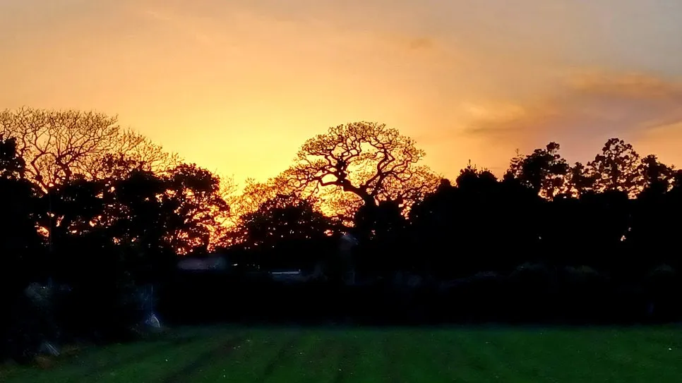 대정고을 향해 벌판길 걷는데 건너편 숲에 어린 금빛 노을이 고왔다.