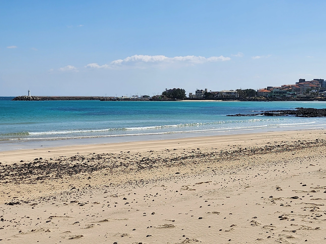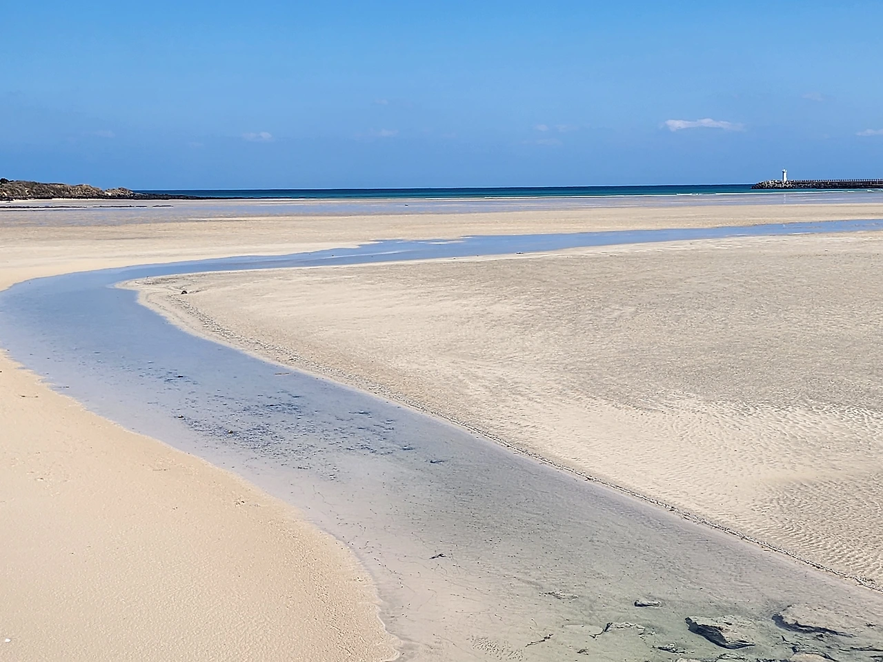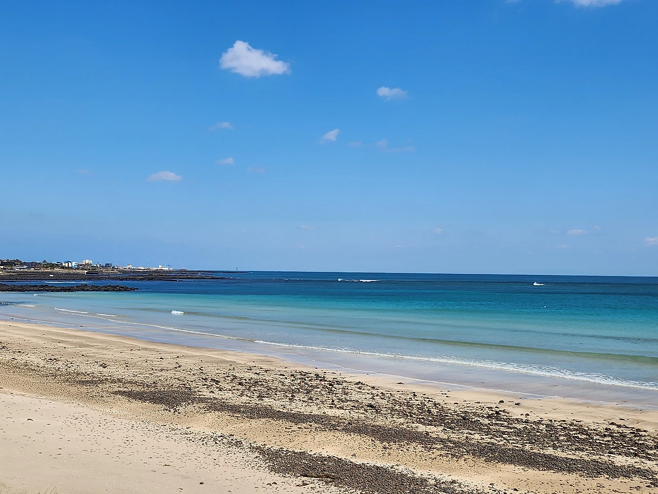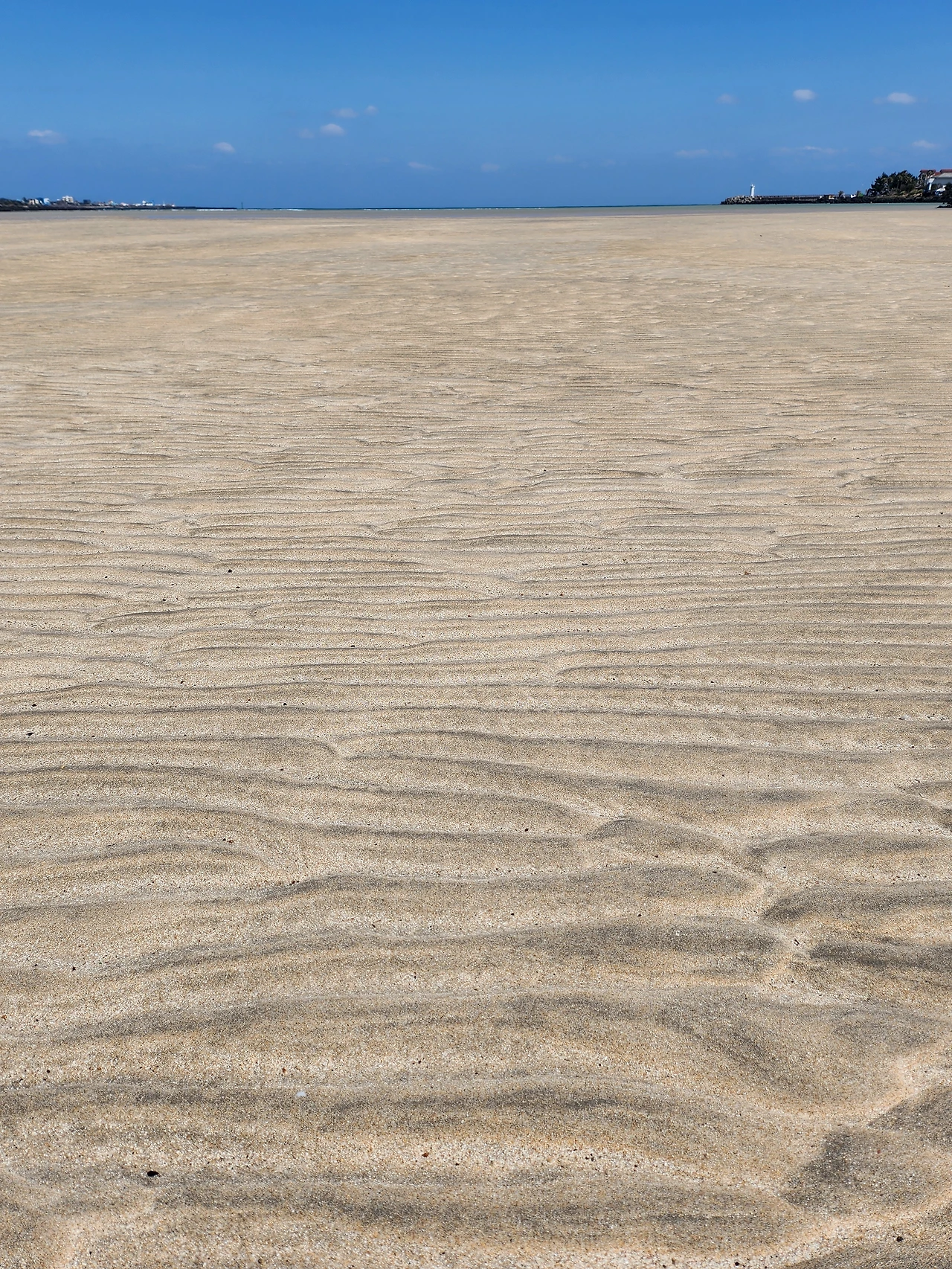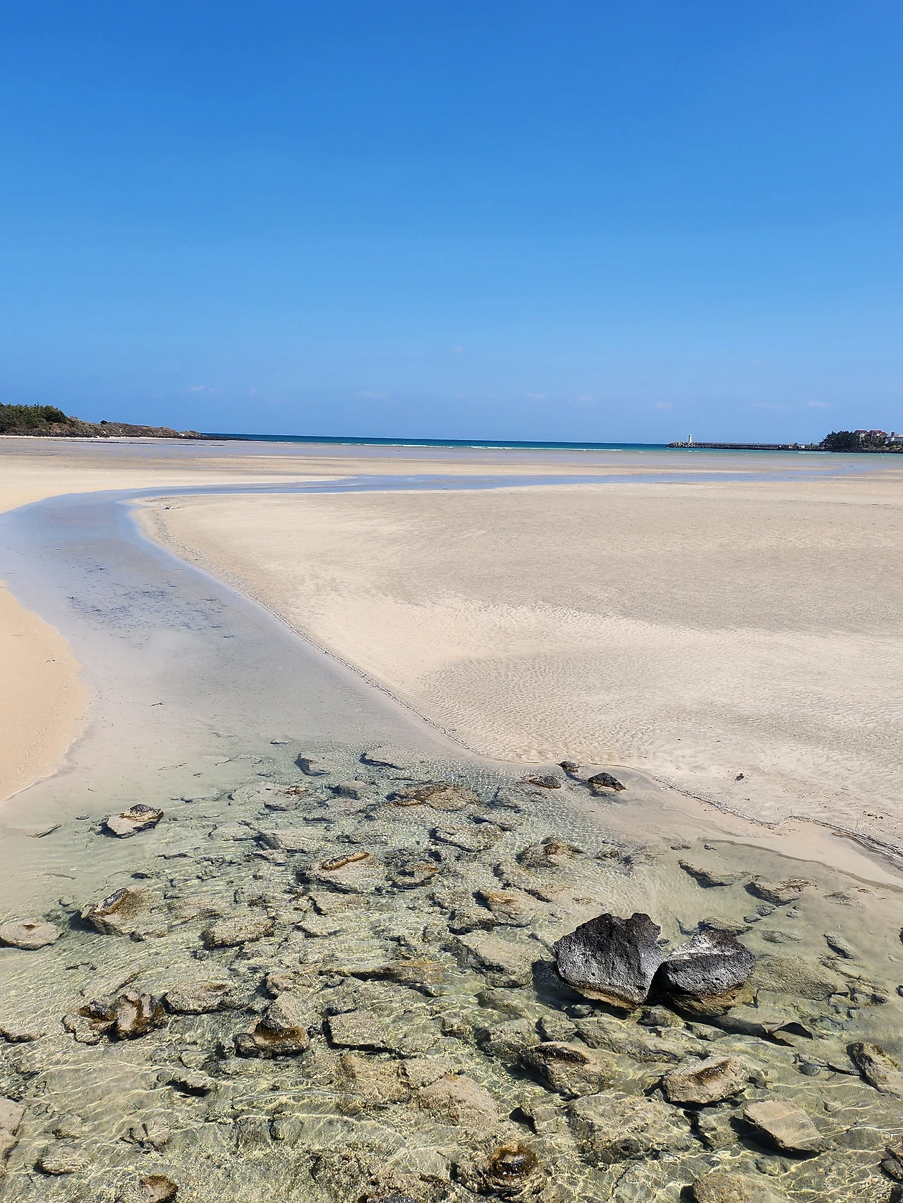만조 때는 잔잔하고 투명한 호수였다가 썰물 때가 되면 드넓은 모래톱 새하얗게 열리며 모래사장 저 멀리까지 맨발로 걷고 싶은 충동 일바치는 표선 바다.