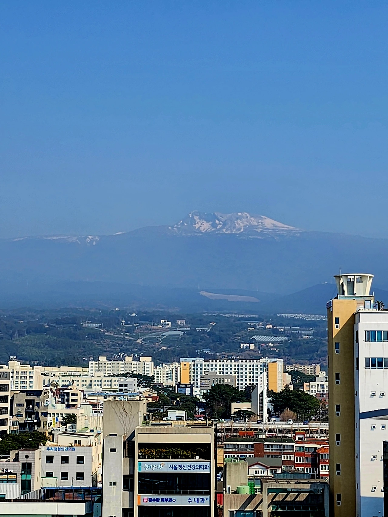 가시거리 무제한이나 대기질은 보통인지라 한라산 백록담 설경이 희끄무레, 먼 히말라야 봉우리처럼 아득해 보인다.