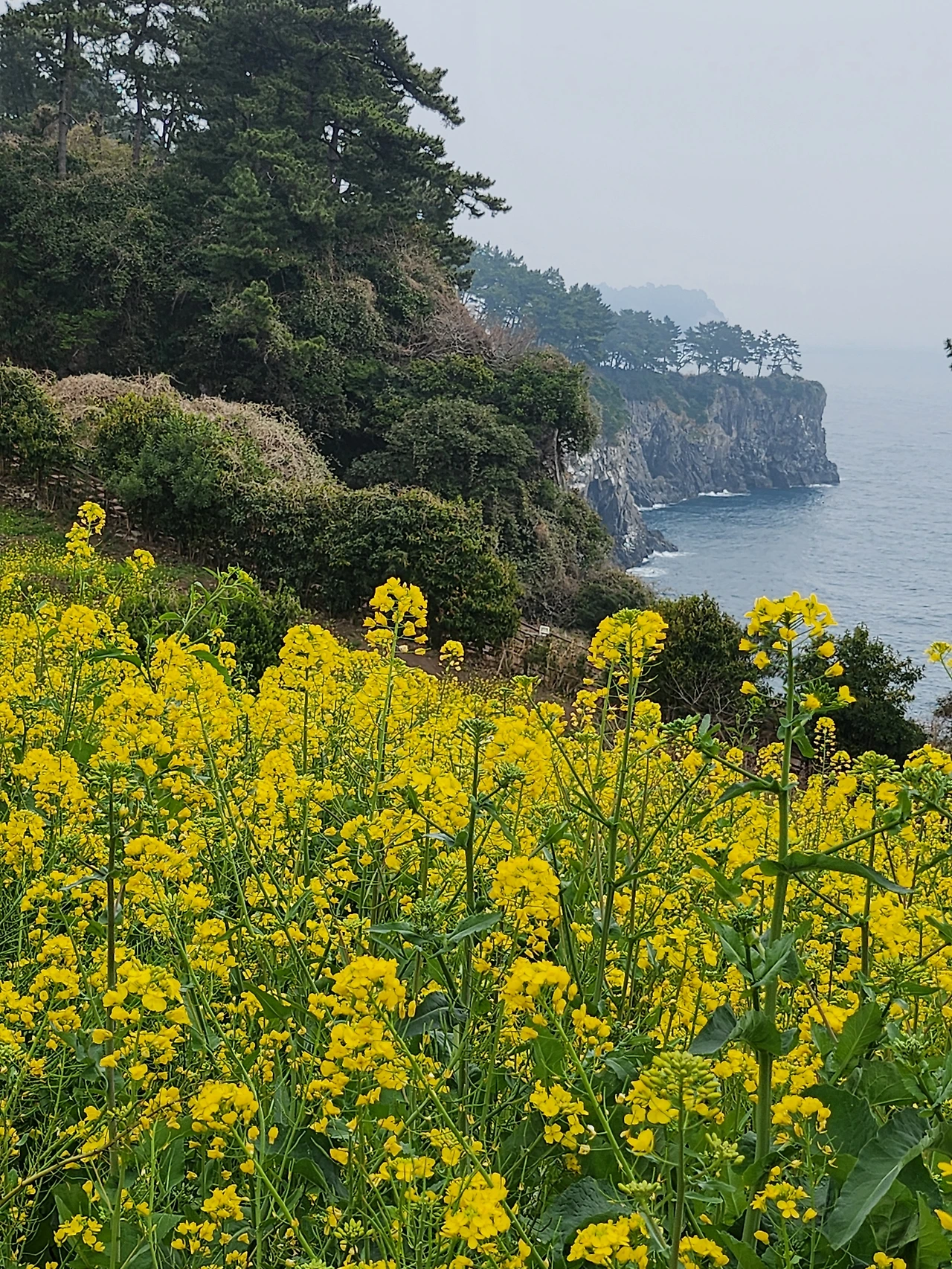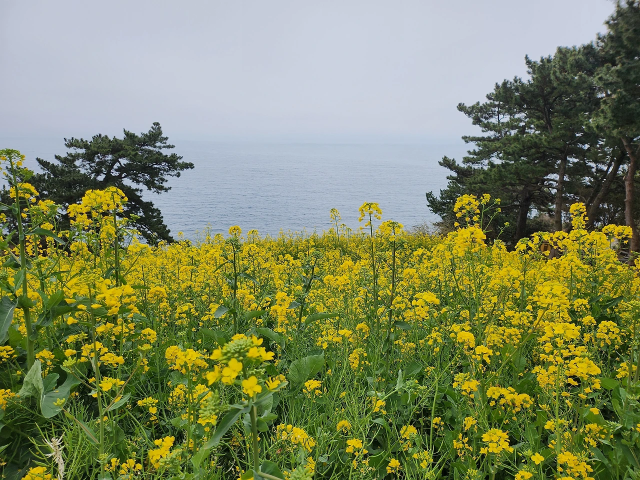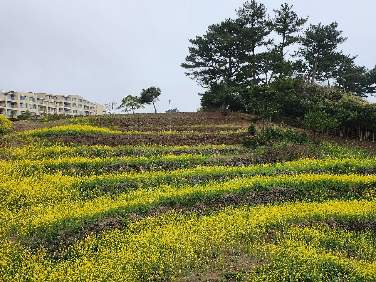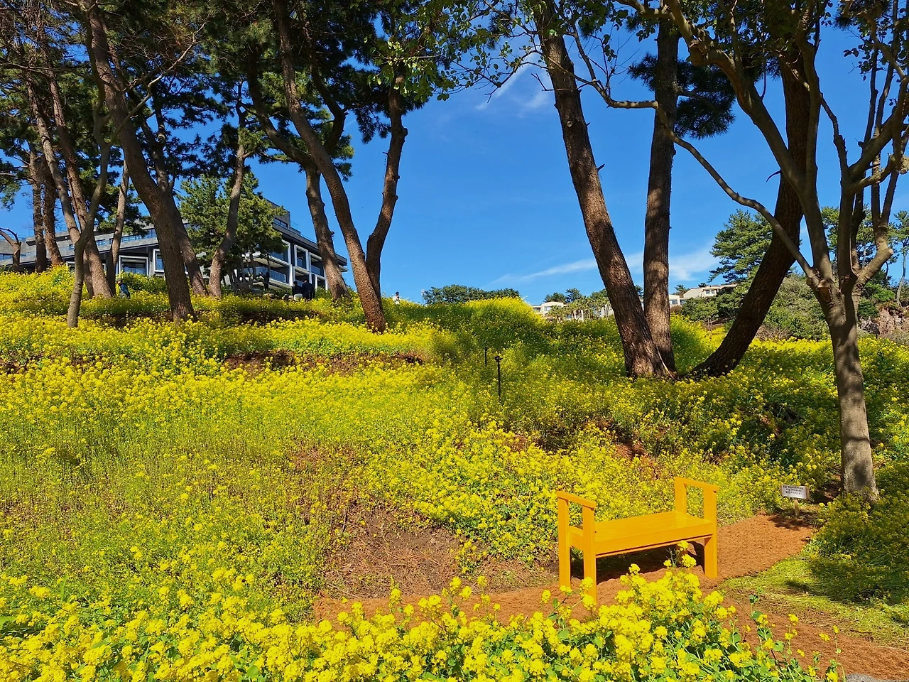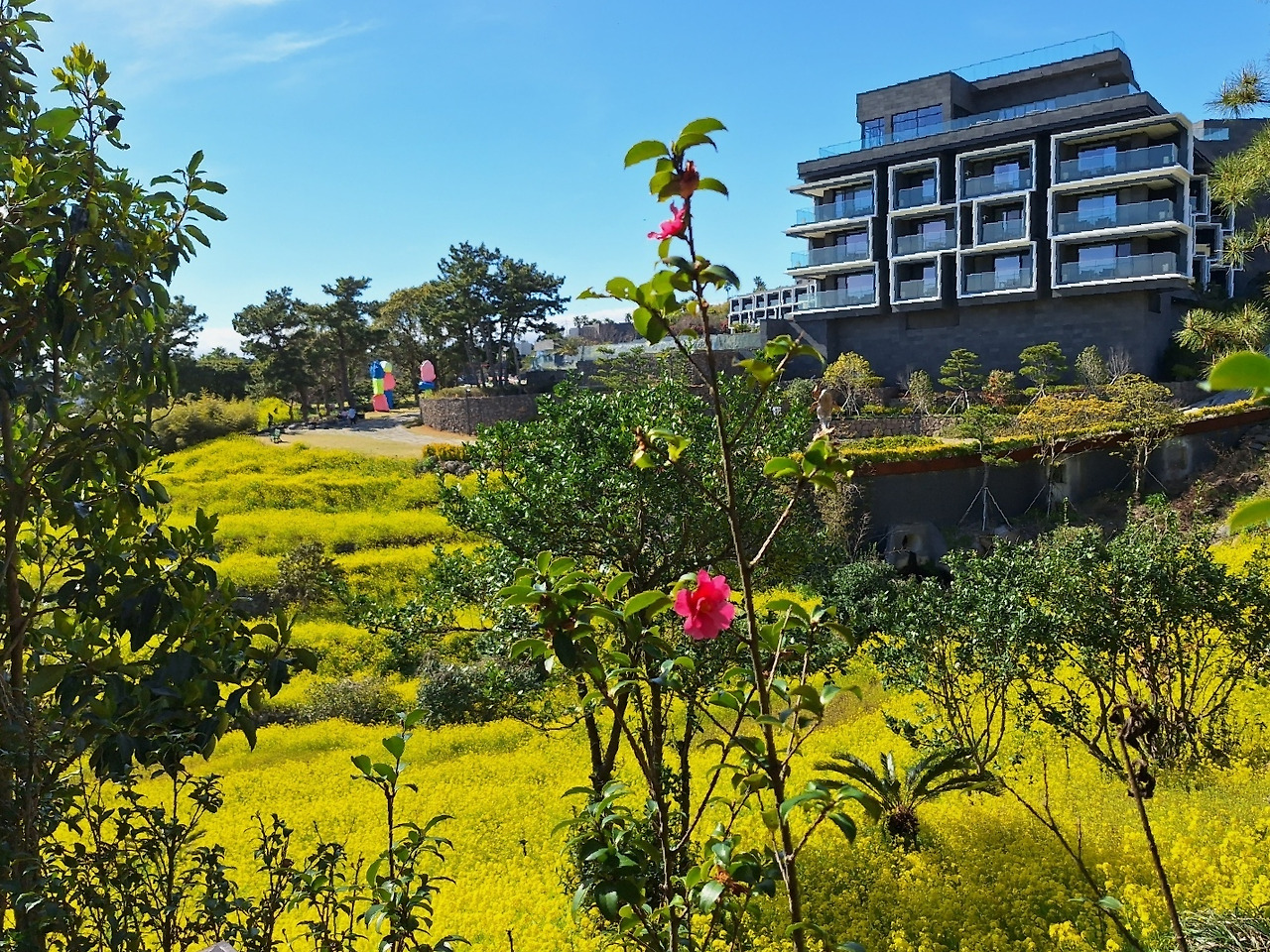 이태 전 돔베낭골에서 외돌개로 걷다가 새로 오픈한 호텔 정원에 흐드러진 유채꽃물결을 만나 감탄사 발했던 터다.