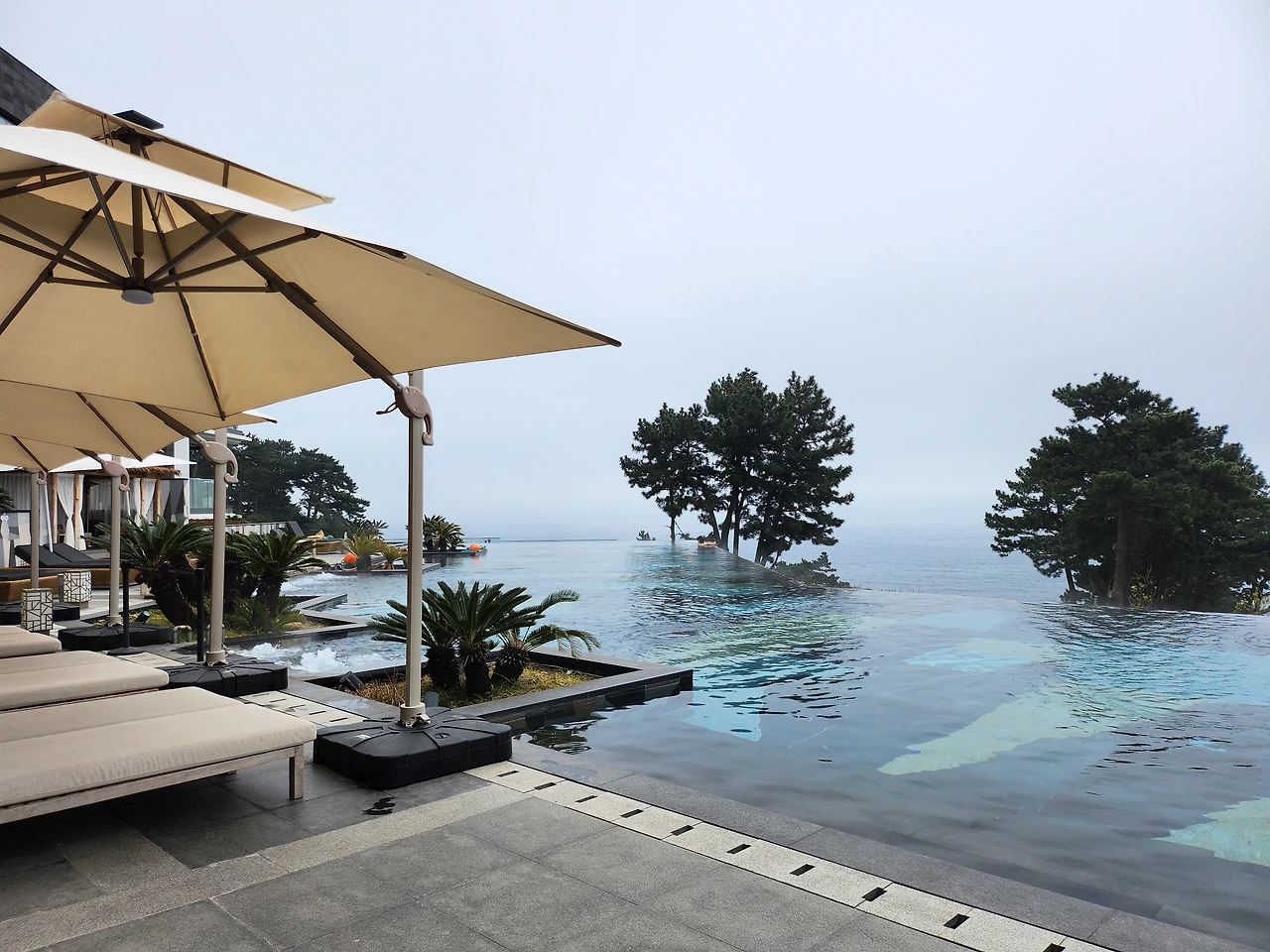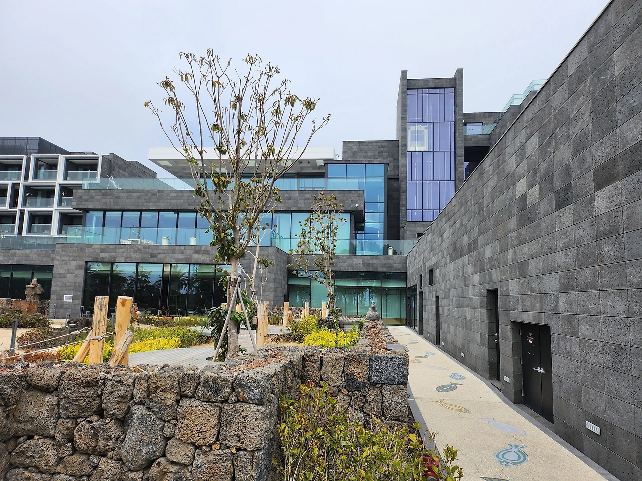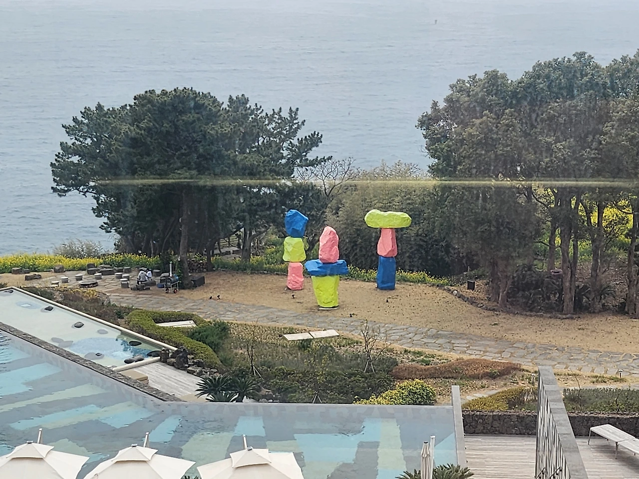JW 메리어트 제주는 건축 거장 빌 벤슬리(Bill Bensley)가 인테리어 디자인을 맡은 국내 첫 호텔로, 앞 뜰에 세 무더기 바위덩이 조각품은 프랑스 작가 니키 드 생팔의 명성 높은 작품이란다.