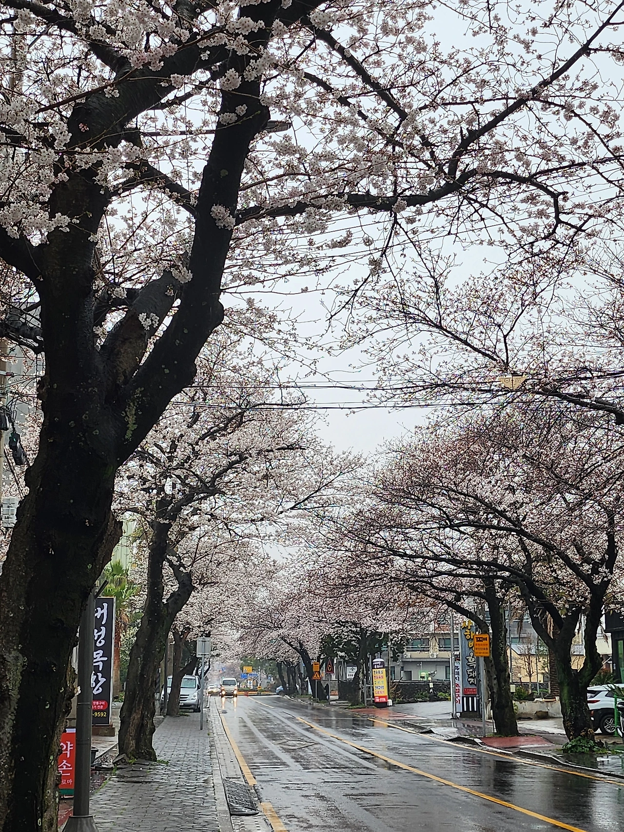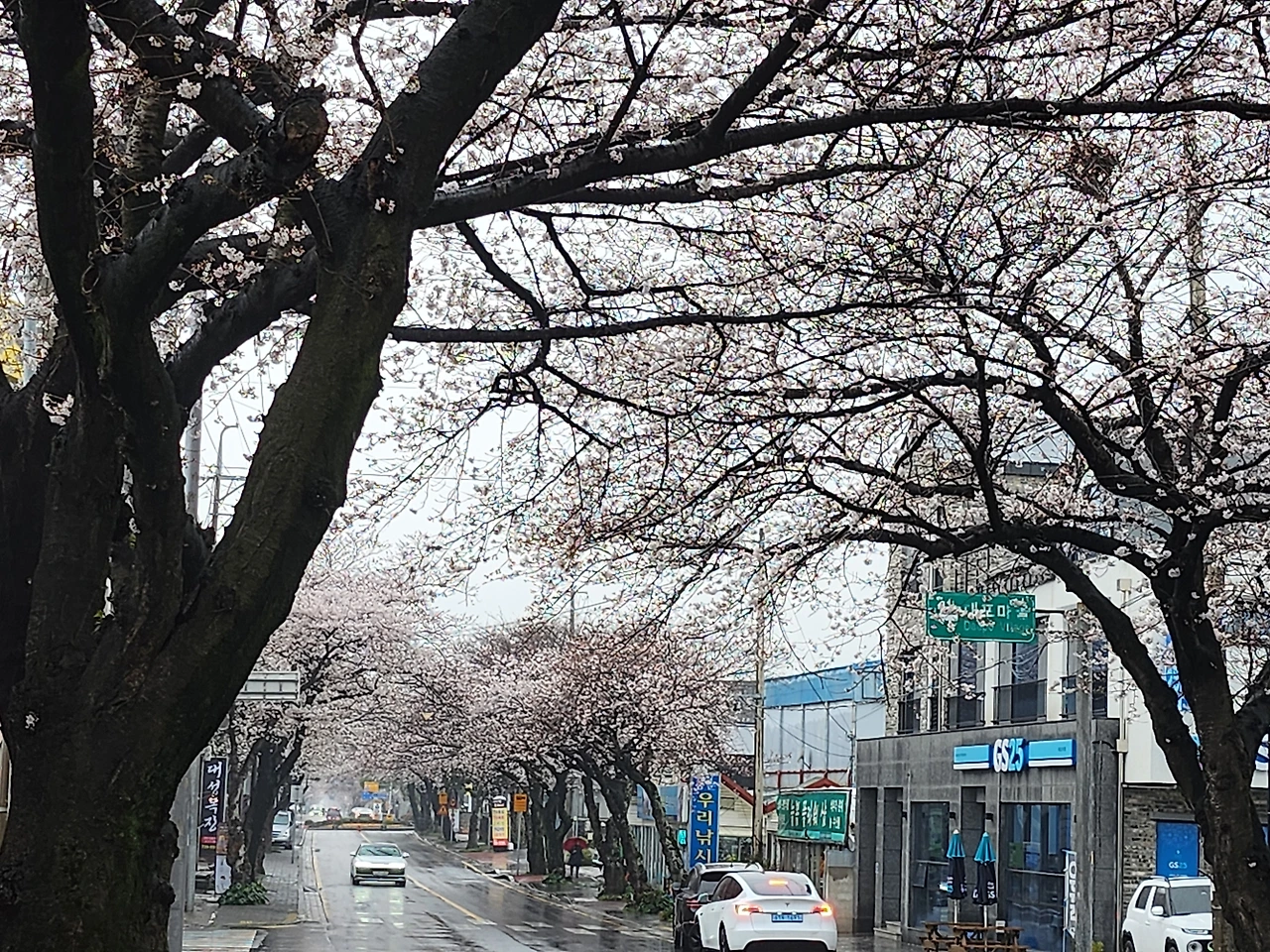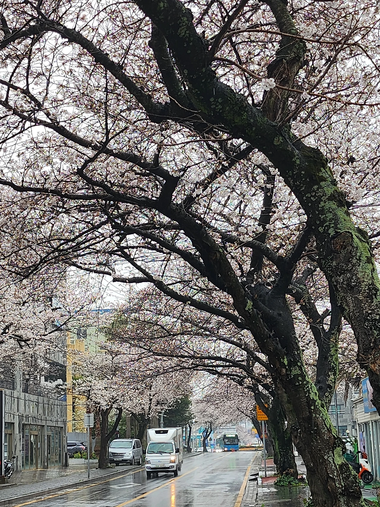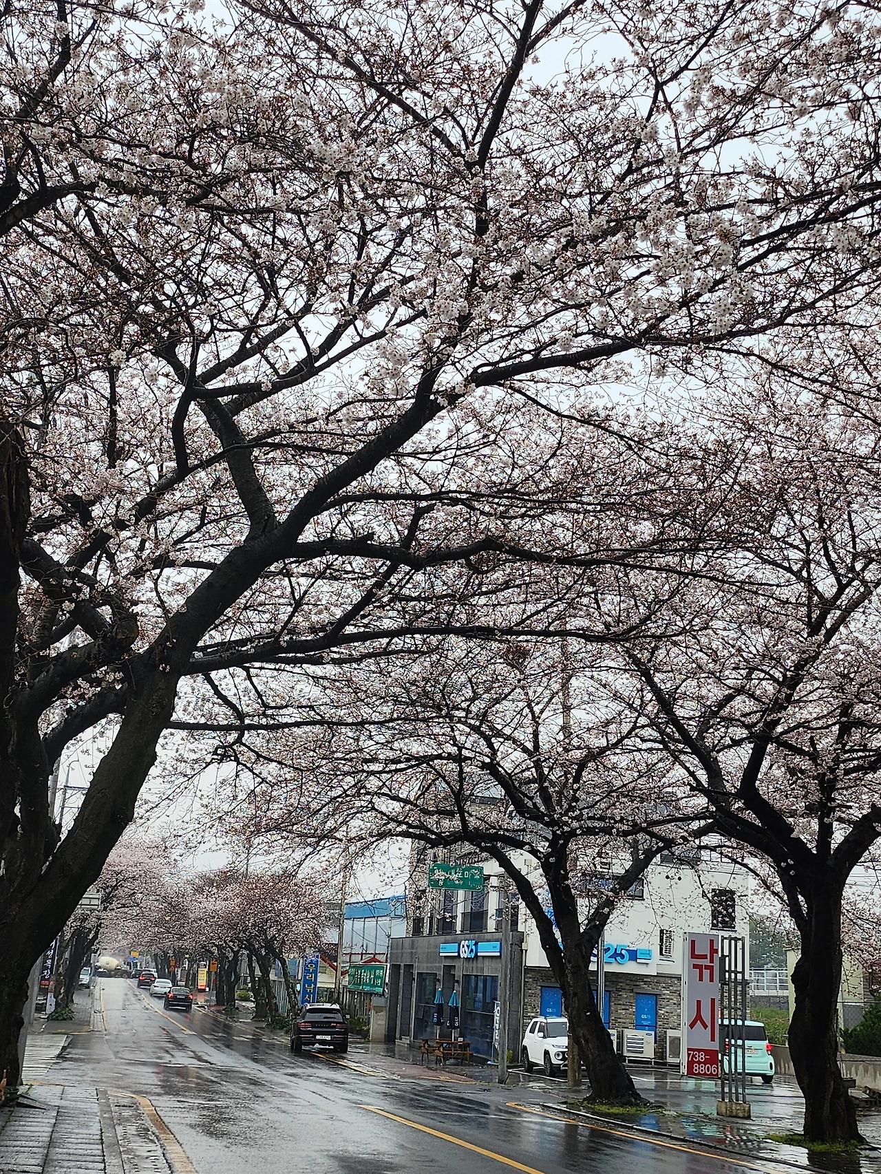 중문에 이르자 해묵은 고목 줄지어 선 가로에 벚꽃이 뿌연 빗속에서 환히 피어있었기 때문이다.