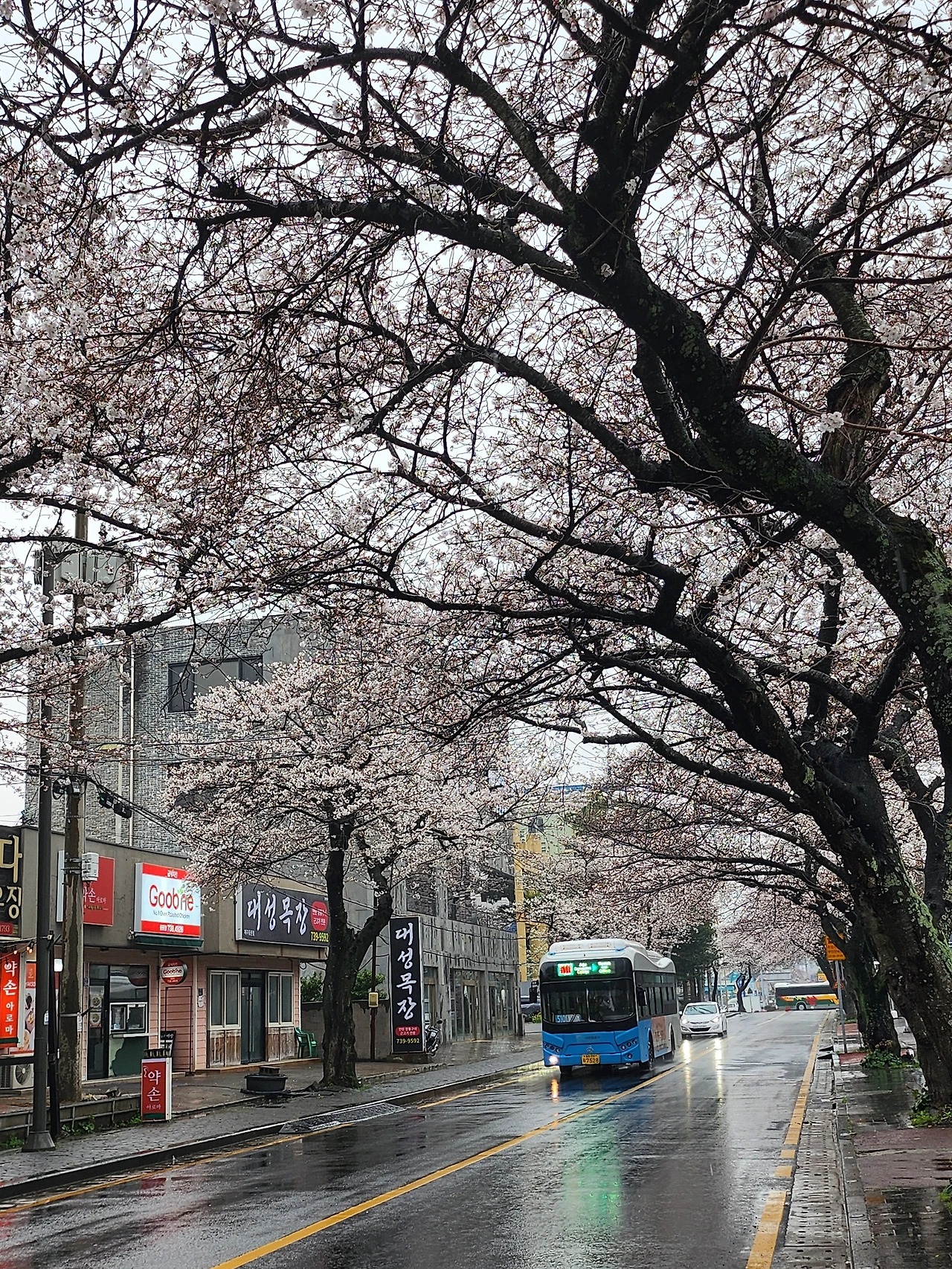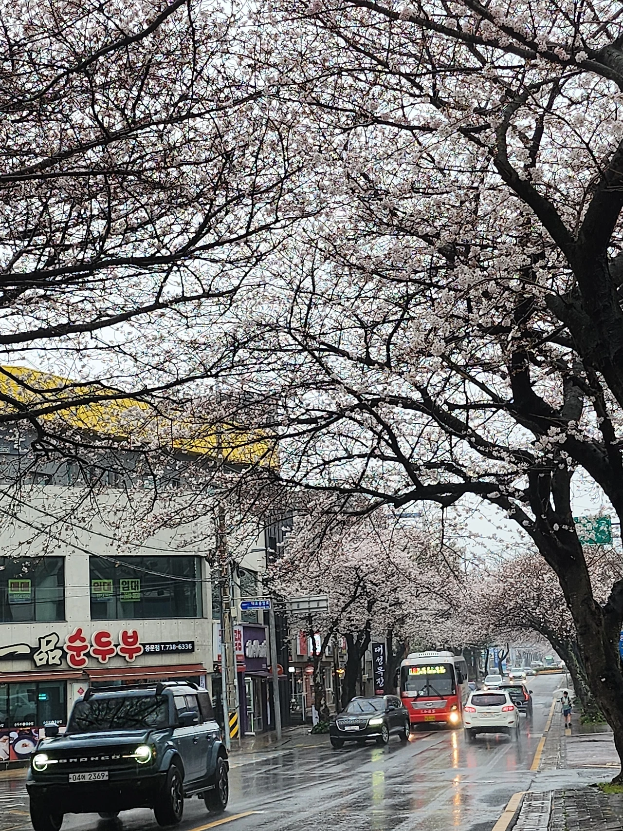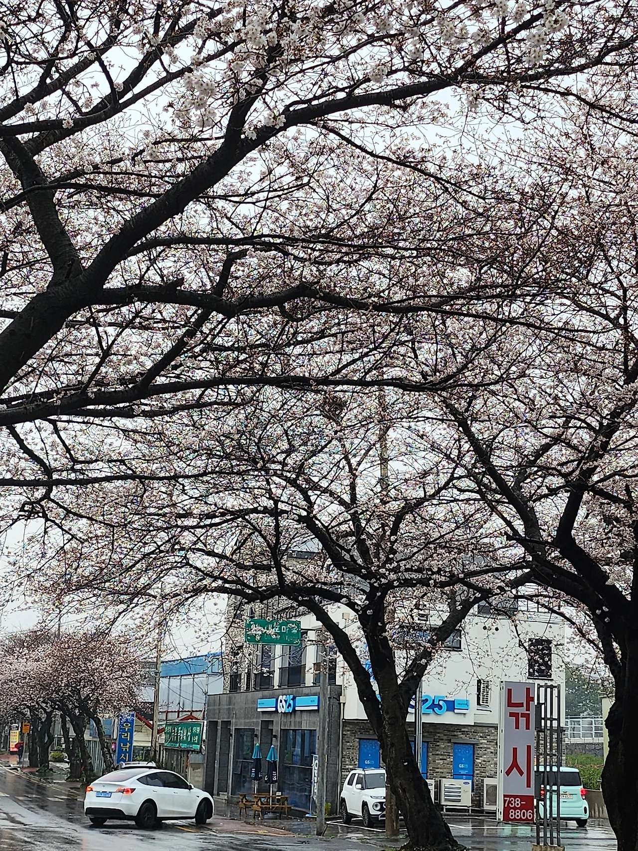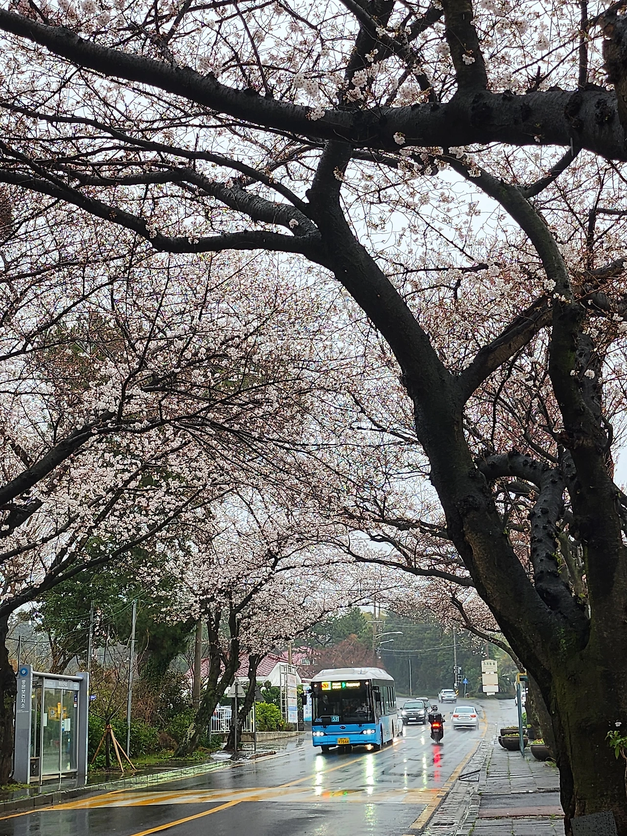 중문에 이르자 해묵은 고목 줄지어 선 가로에 벚꽃이 뿌연 빗속에서 환히 피어있었기 때문이다.