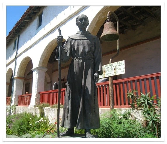 선교사 Serra의 동상과 단순한 모양의 종. 이끼 두터운 위엄 어린 석조 분수대.