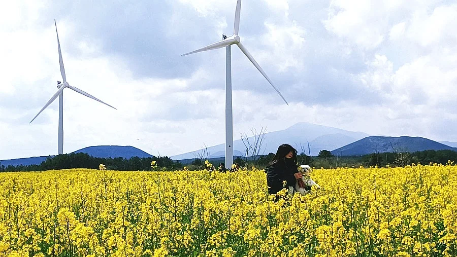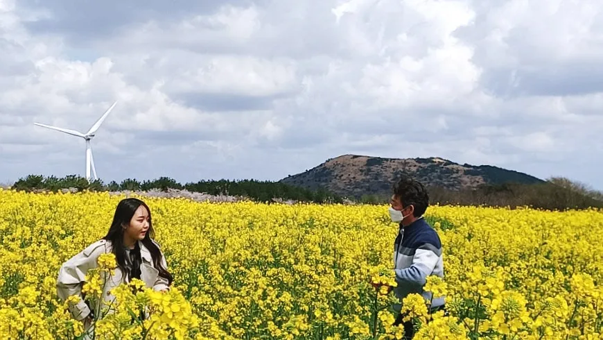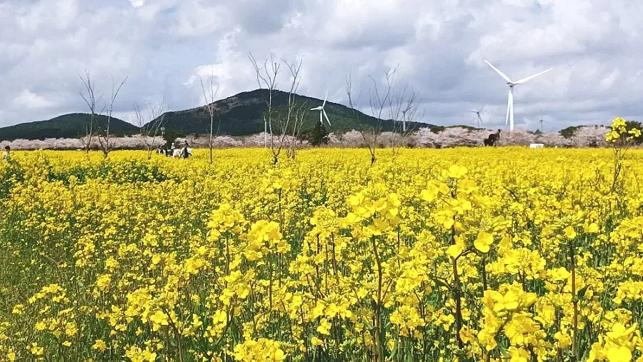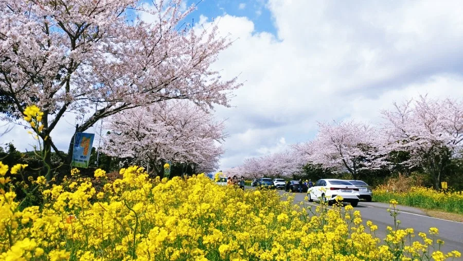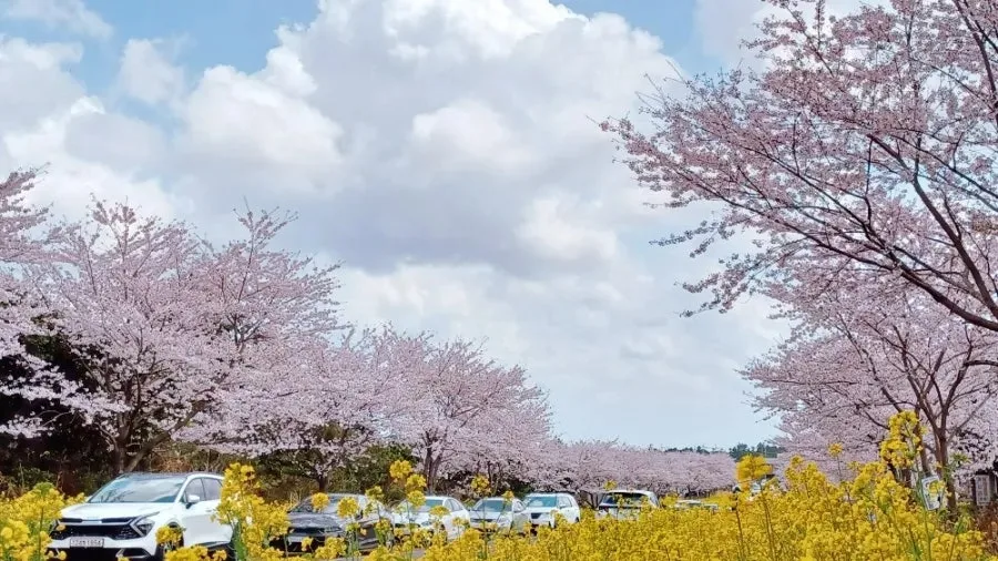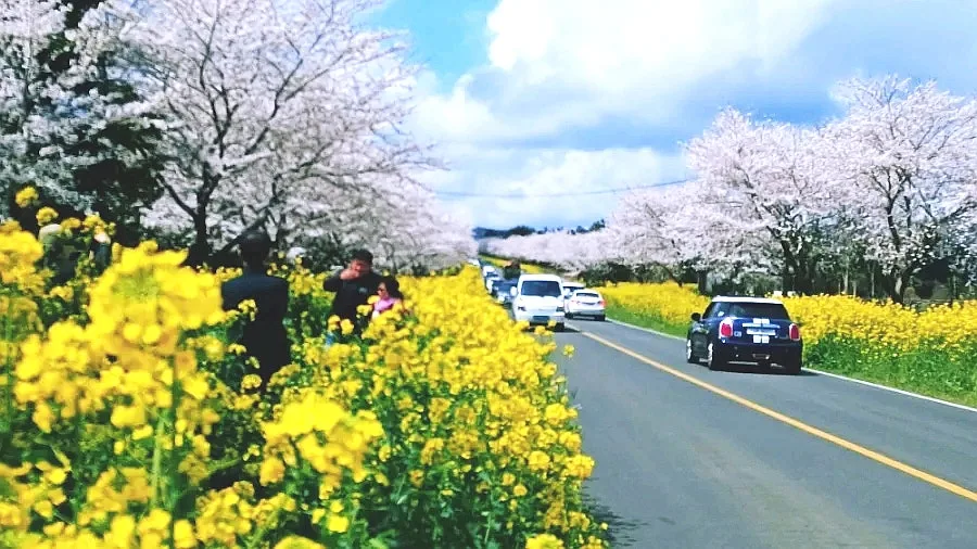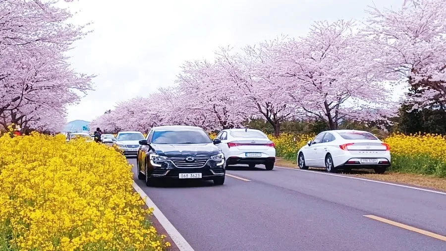 서귀포시 표선면 가시리 녹산로에선 절정 맞은 유채꽃과 벚꽃이 상춘객들을 유혹한다.