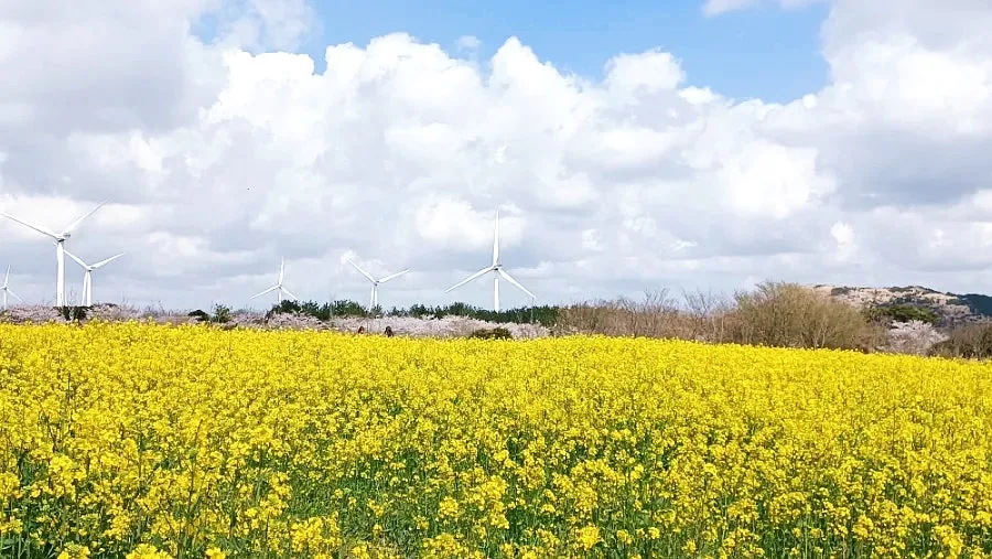창공엔 벚꽃구름 살랑살랑, 길섶엔 유채꽃 물결져 산들산들 .