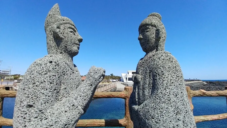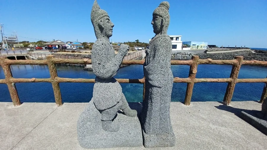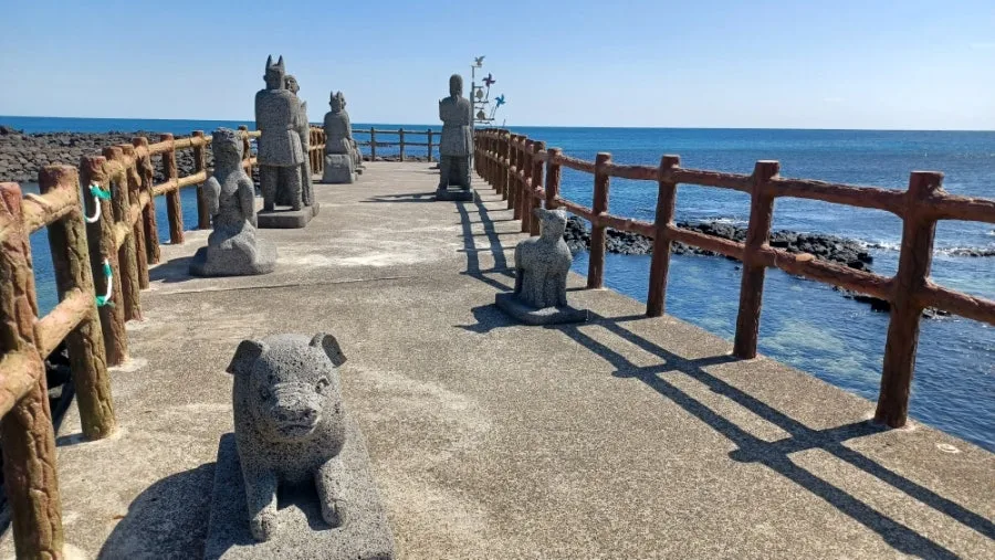포구 앞에는 바닷길 저만치 뻗은 다릿길 위에서 세 신인이 세 공주를 맞는 장면의 석상이, 거느리고 온 동물들과 함께 서있다.