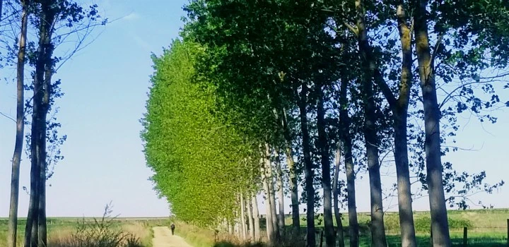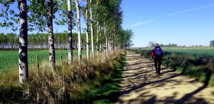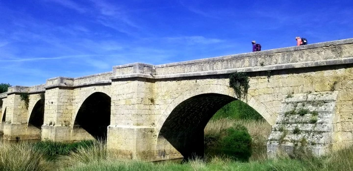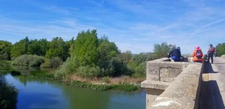 매가리 없이 터덜거리며 걷다 보니 푸른 강줄기가 나타났다. 시원한 물빛에 그나마 기운을 차리게 되었는데 피수에르가 강 위에 걸쳐진 다리는 더더욱 굉장했다. 메세타 지역의 단조로움에 지친 우리를 위로하듯 강바람 시원하게 불었고 강을 건너는 동안 눈빛 바짝 긴장시킨 다리였다. 그럴 만큼 '시작하는 사람들의 다리'라 불리는 길고도 견실한 이테로 다리 (Puente de Itero)는 카미노 길손을 압도해 왔다. 석재가 귀해 성당조차 벽돌로 짓는 대평야 지대인데 화강암 석조 다리라니. 그럴 만도 한 것이 에스파냐의 전쟁왕 알폰스 6세가 카스티야와 레온 두 왕국을 합친 걸 기리려고 만든 다리는, 열한 개의 아치가 떠받드는 대단한 교각이었다. 물가라서 인지 인근엔 이파리 한창 피어나 팔랑거리는 미루나무도 서있었으며 밀밭 푸른 초장이 드넓게 펼쳐졌다.
