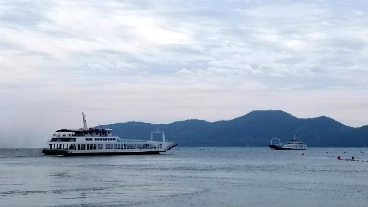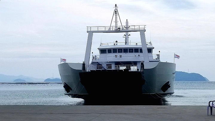 출발신호를 받은 철부선은 차량까지 실어 나르는 세련된 여객선이다.