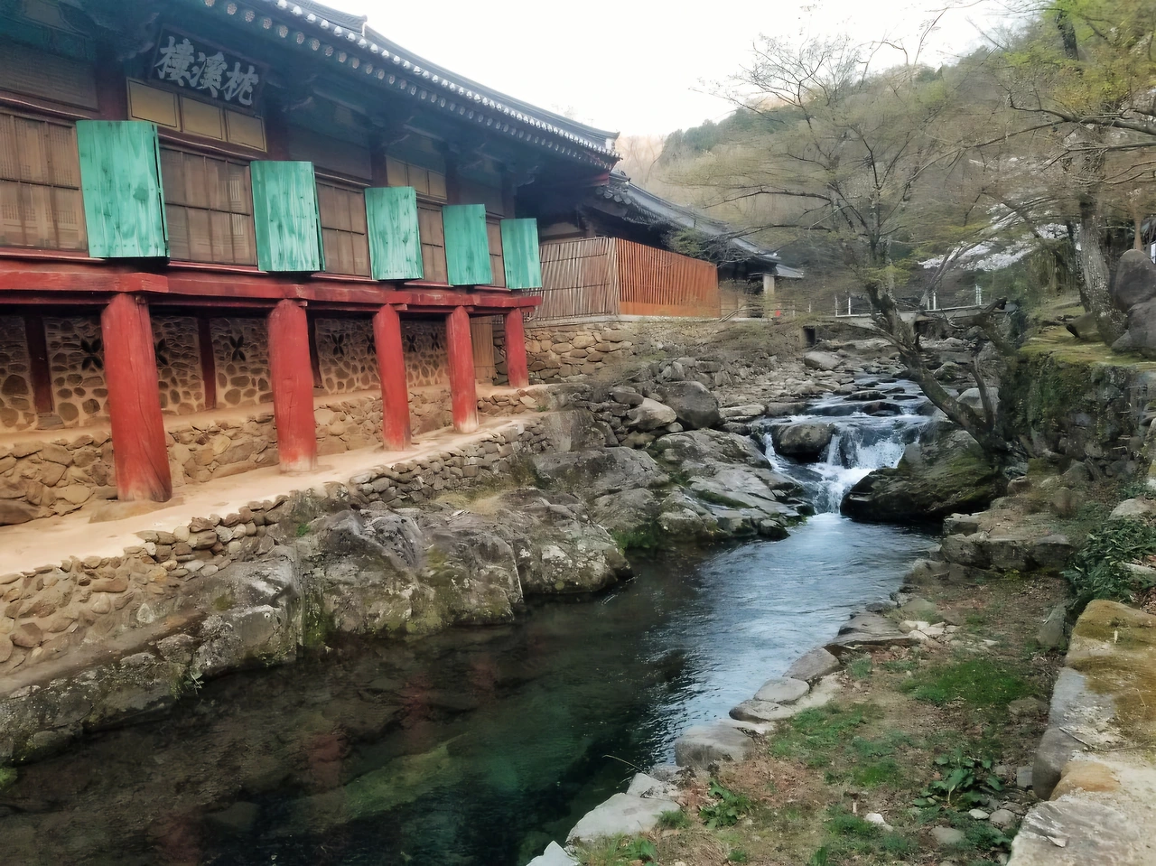 계류 건너편 침계루(枕溪樓) 편액이 걸린 건물, 동일 건물이나 도량 안 현판은 사자루(獅子樓)