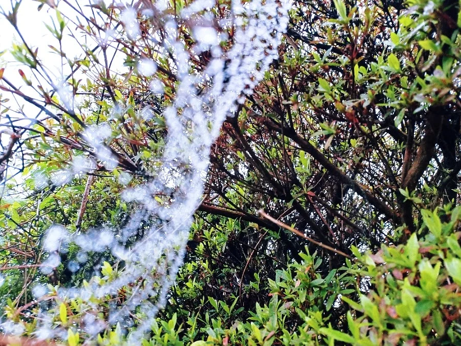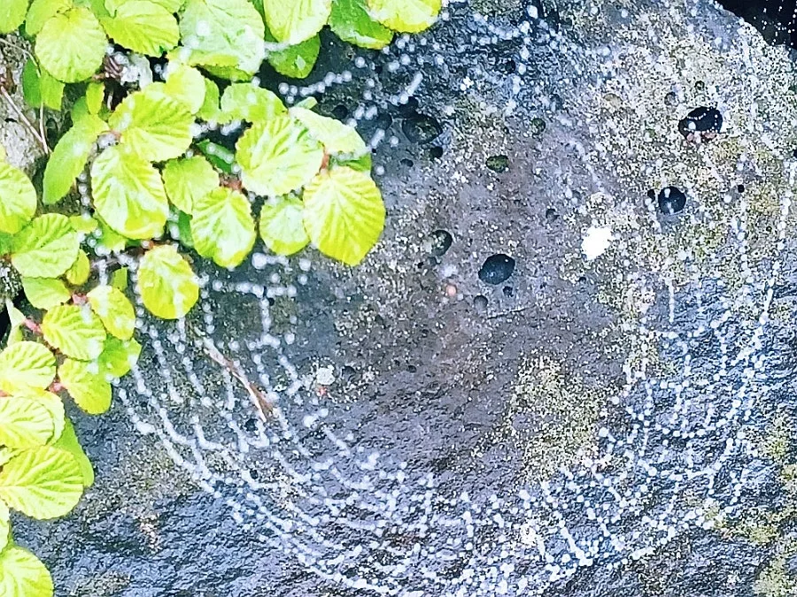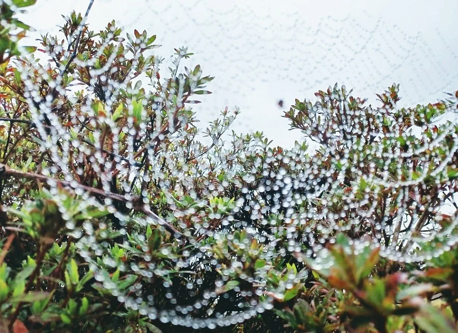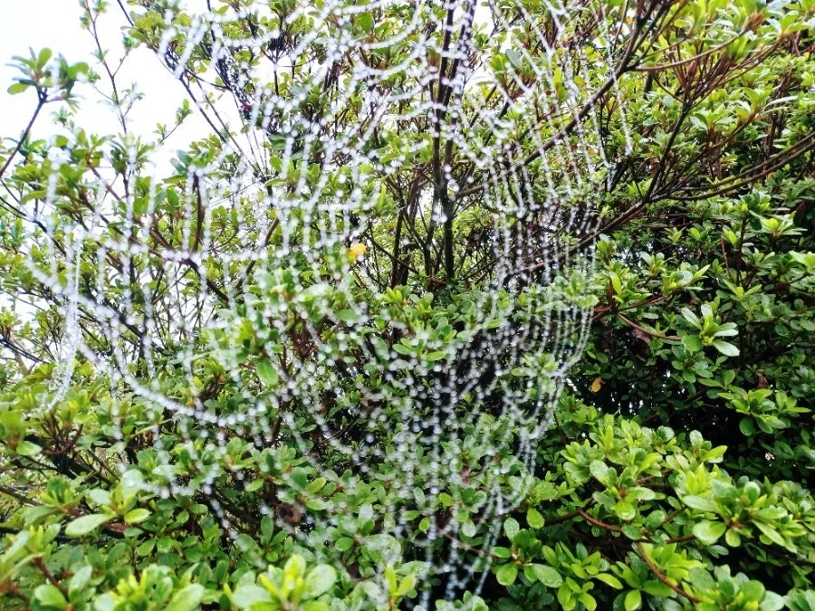 잠깐 이슬비가 내리자 보이지 않던 거미줄에 옥구슬 조롱조롱 매달렸다.