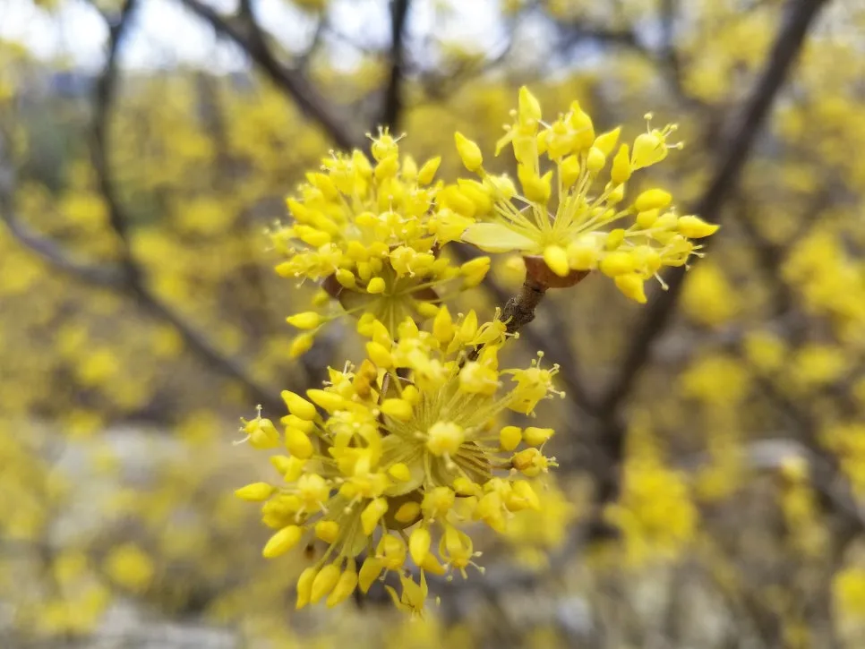 산수유는 한약재의 기본 원료로 자양강장 효과 및 신경계통과 당뇨병, 고혈압, 관절염 등에 효험이 있다고 동의보감에 적혀 있다.