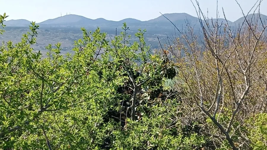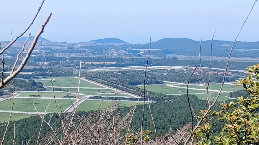 저 멀리 한라산 기슭에는 작은 화산체인 오름이 여러 개 울멍줄멍 산재해 있다.