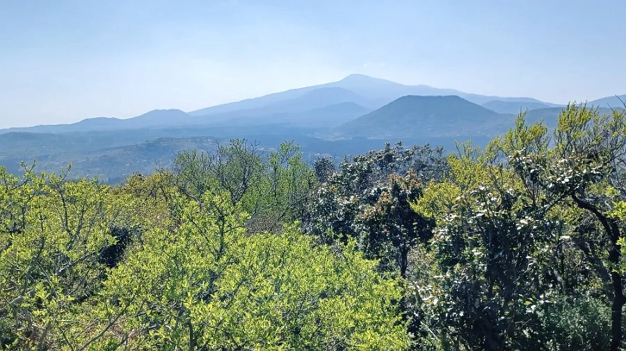 왼편짝에 다소곳 온순하게 생긴 오름이 봉긋, 신록의 숲 새새로 산벚나무 꽃 만개해 하얗게 웃고 있는 붉은오름.
