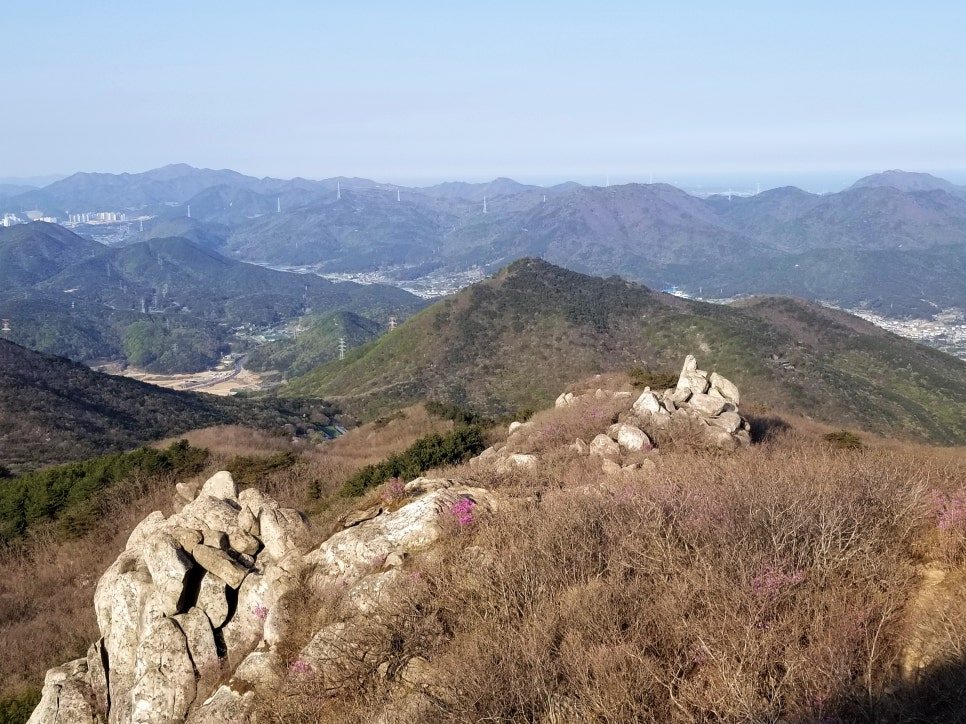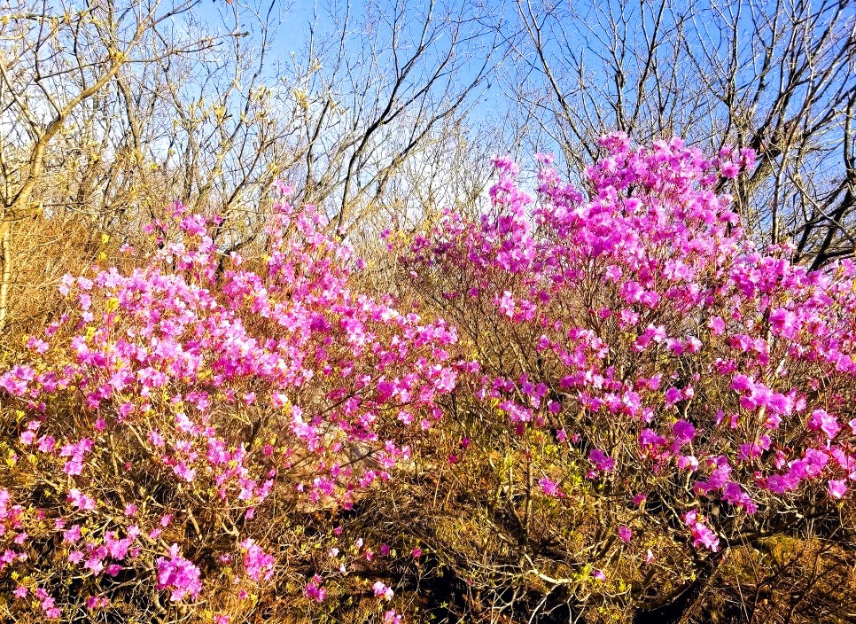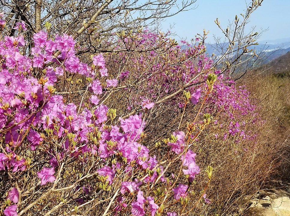 태백산이나 덕유산 겨울 산행을 해야 만나던 상고대며 설화나 마찬가지, 금정산 고지에 오를수록 진달래꽃 선물이 푸짐하다.