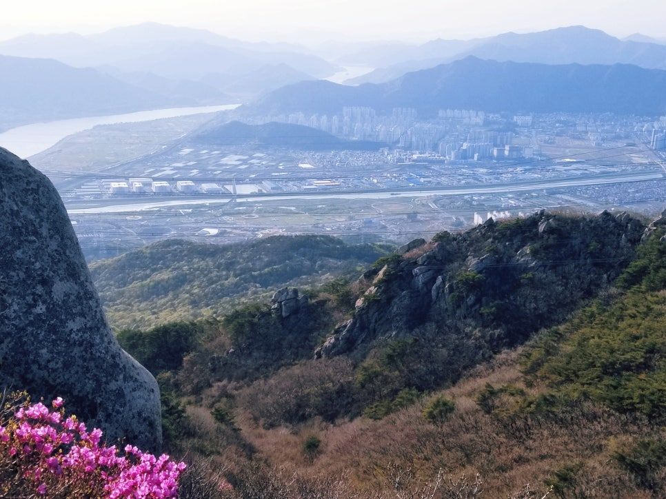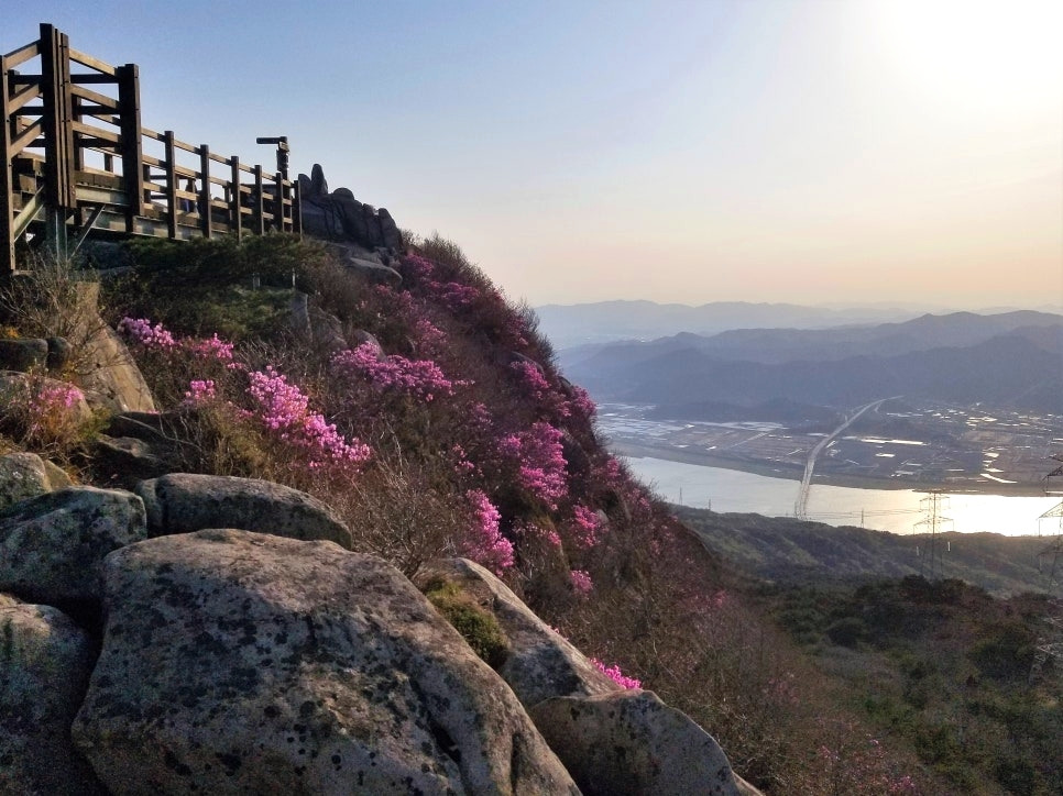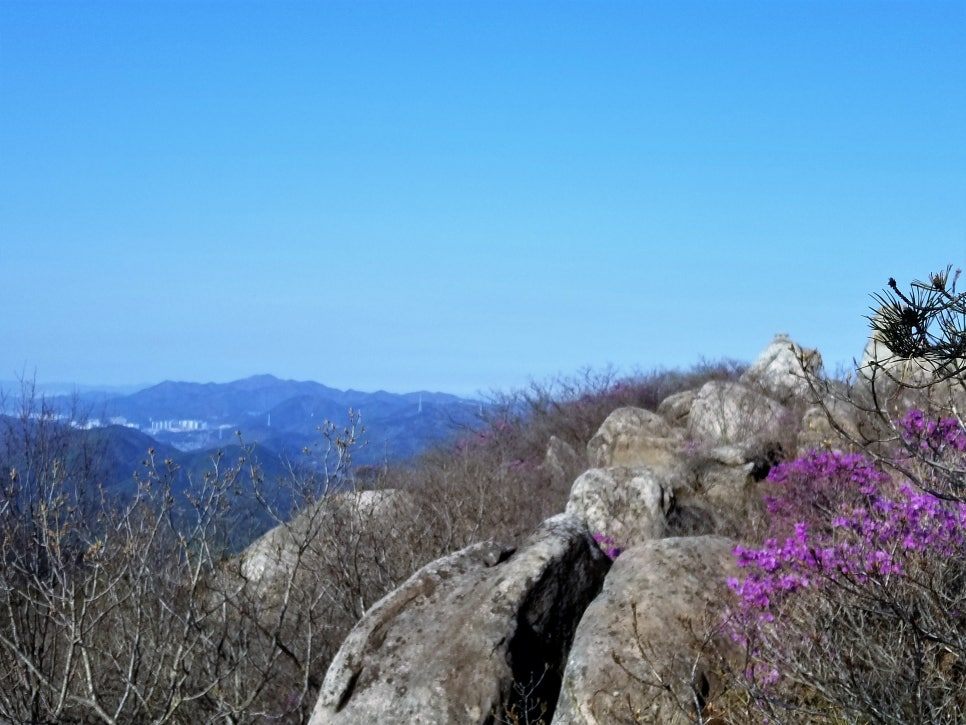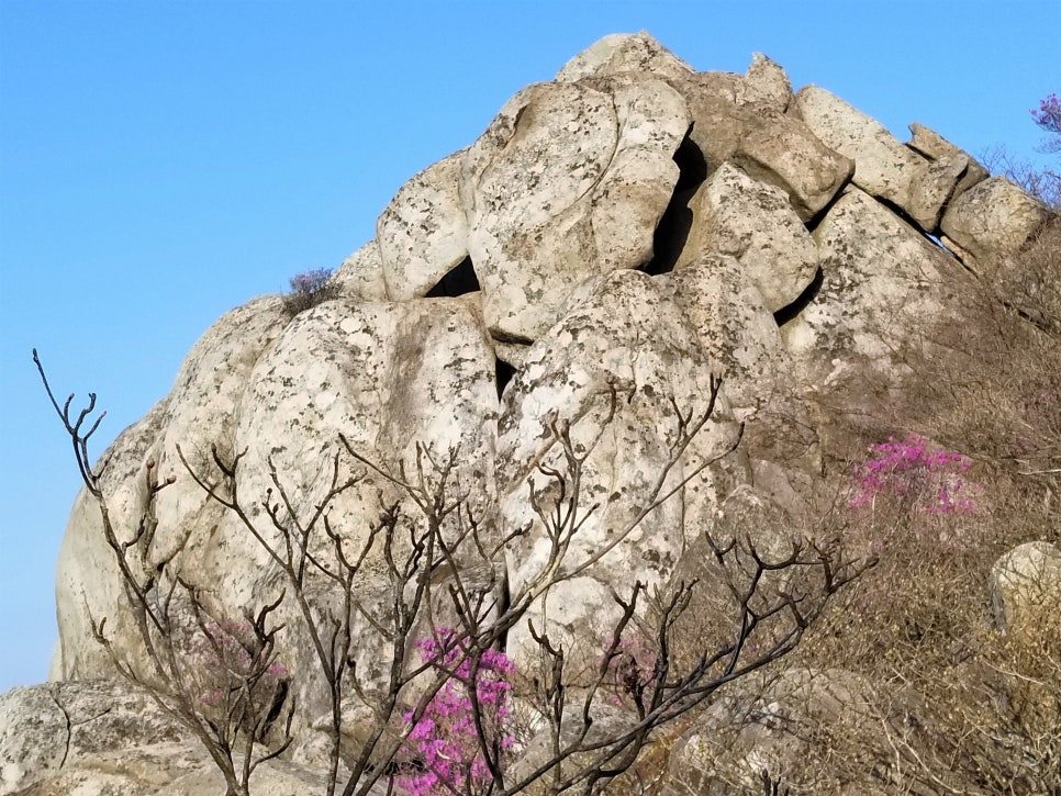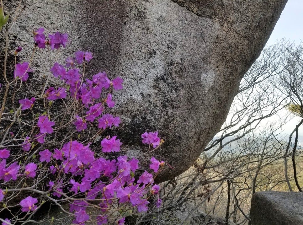 어느새 눈앞에 우뚝한 고당봉 마주하니 바위로 된 봉우리 전체에 화염 번지듯 진달래꽃 점점이 환하다.