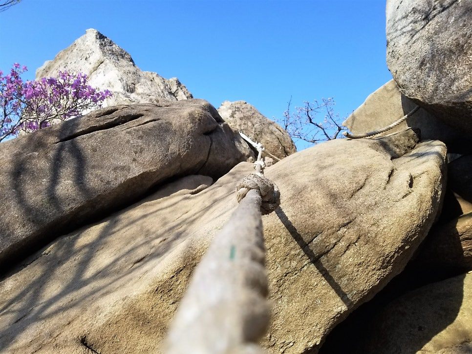 이처럼 어마무지하게 큰 바위 무더기가 아니었는데 로프를 타고 올라가야 하는 아주 험한 바위, 주춤해진다.