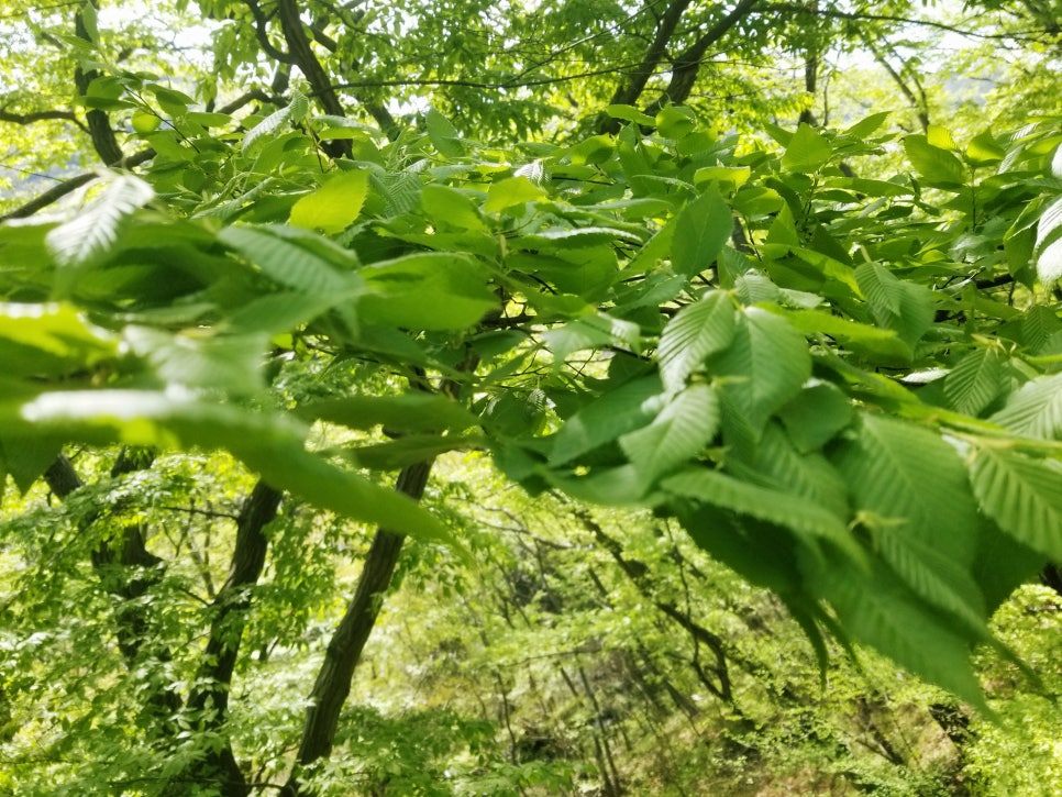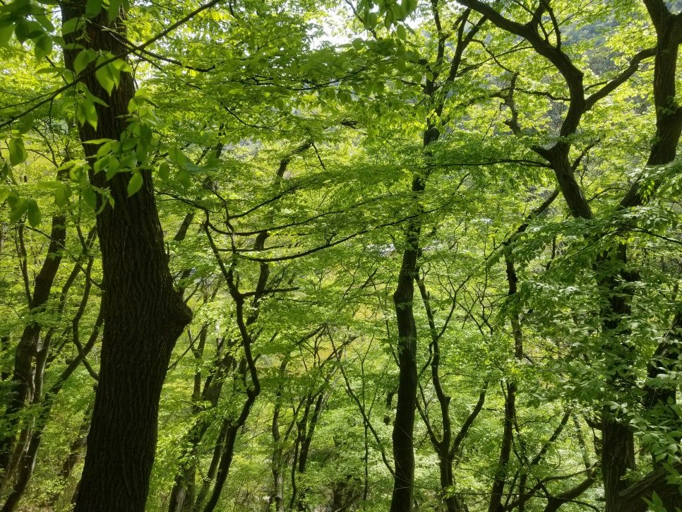 눈엽 싱그런 활엽수림이 따르는 길에서 잠깐 돌아서보면 맞은편으로 계명봉이 시야에 올연한 자태 드러내기 시작한다.