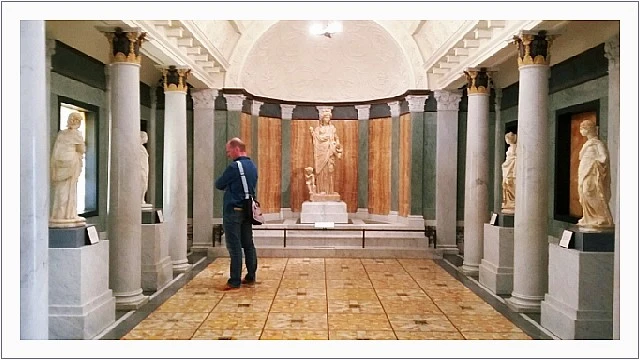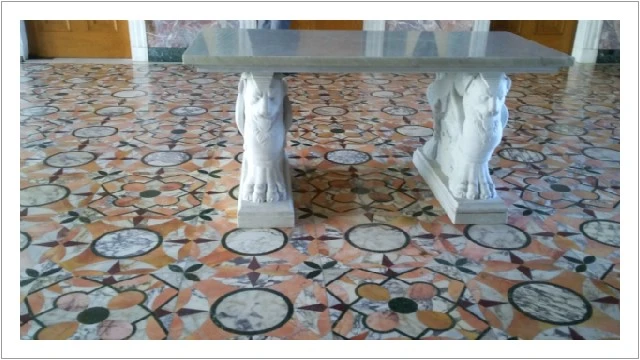 위의 건물 사진에도 바닥재가 특이하듯 게티빌라 처처마다 어디 한 군데 손길 소홀한 데가 없었다. 사진에 나타난 것처럼 로비나 복도, 전시실 모든 바닥재가 제각각 기하학적 문양으로 꾸며진 색색의 대리석이다. 그뿐 아니다. 벽이며 천정 어느 하나도 밋밋하게 처리된 곳이 없었다. 주랑의 원형 기둥 마다에도 섬세하고 정교한 조각이 아로새겨져 있으며 담벼락인들 단조롭게 그냥 멀거니 서있는 곳은 보이지 않았다. 건물조차도 이리 전체 안팎을 세심 알뜰하고도 정성스럽게 가꾼 게티가 생각사록 대단해 보였다.