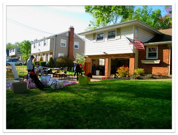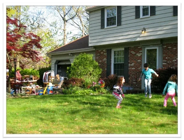야드세일 전이 펼쳐진 뜨락 한편, 엄마는 물건 정리에 몰두하고 아이들은 신나게 함성 지르며 뛰놀고요