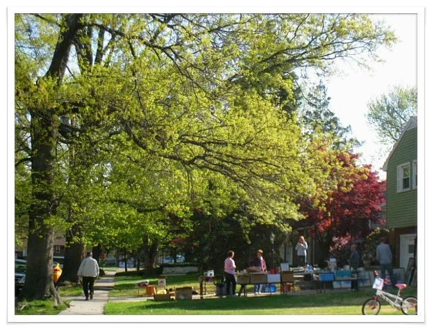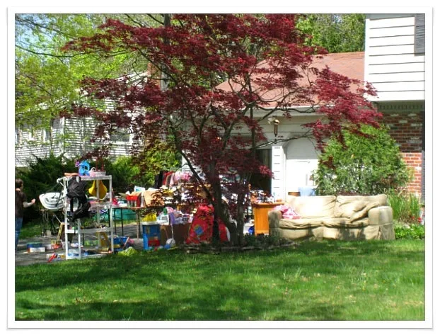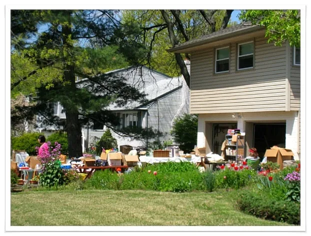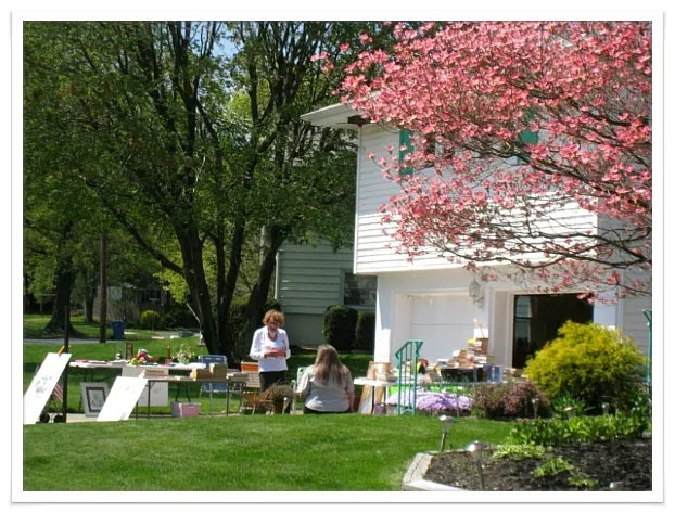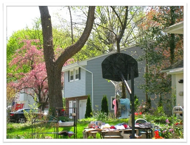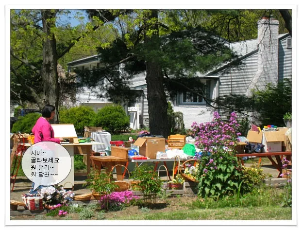 이른 아침 햇살이 새잎 위에 내리는 이웃집 뜨락에 소박한 야드세일 장이 펼쳐졌네요