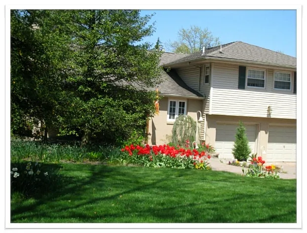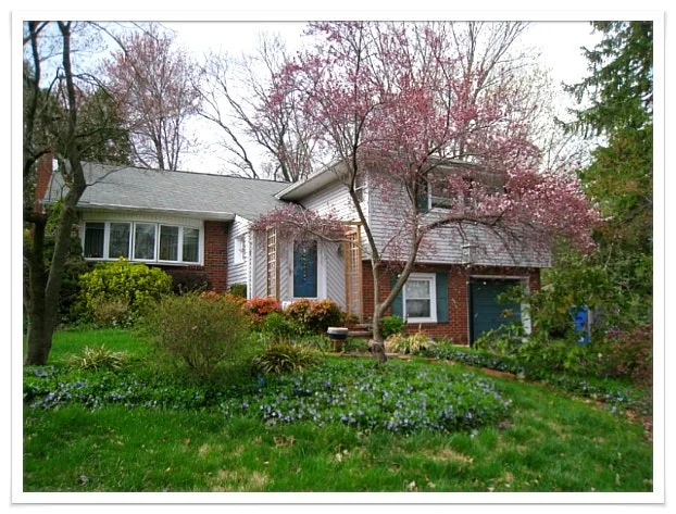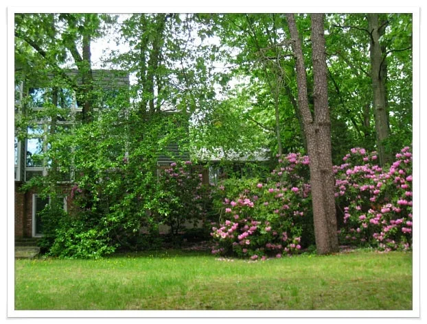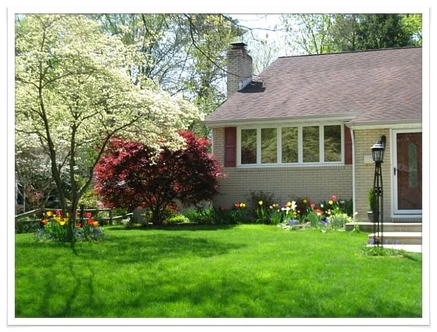 초록 잔디와 어우러진 철쭉꽃 도그우드꽃 화사한 벽돌집 뜰 전경이 봄답기에 한컷~