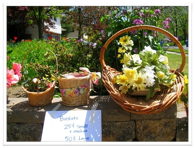 꽃 바구니가 단돈 25센트~50센트, 뒤편 화단의 생화들 저희도 어딘가 떠나보고 싶다는 듯 고개를 기웃대네요