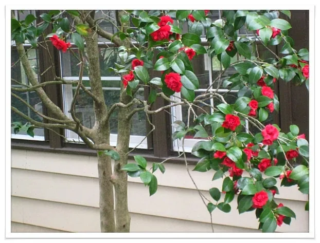 왜식 풍의 어느 집 모퉁이에 창 가리개로 삼은 초라한 겹동백 붉게 타는 열정을 감추려는 듯 숨어 피어있길래