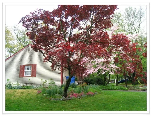 일본단풍나무를 위한 인테리어인가요, 창가와 지붕선을 두른 자주색 페인팅이 한 폭의 액자사진처럼 전체 조화를 이룬 풍경