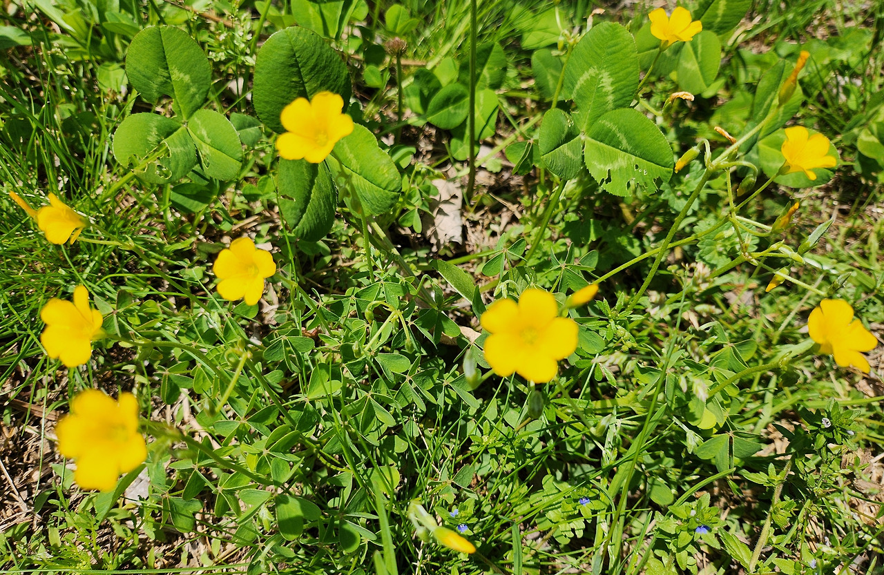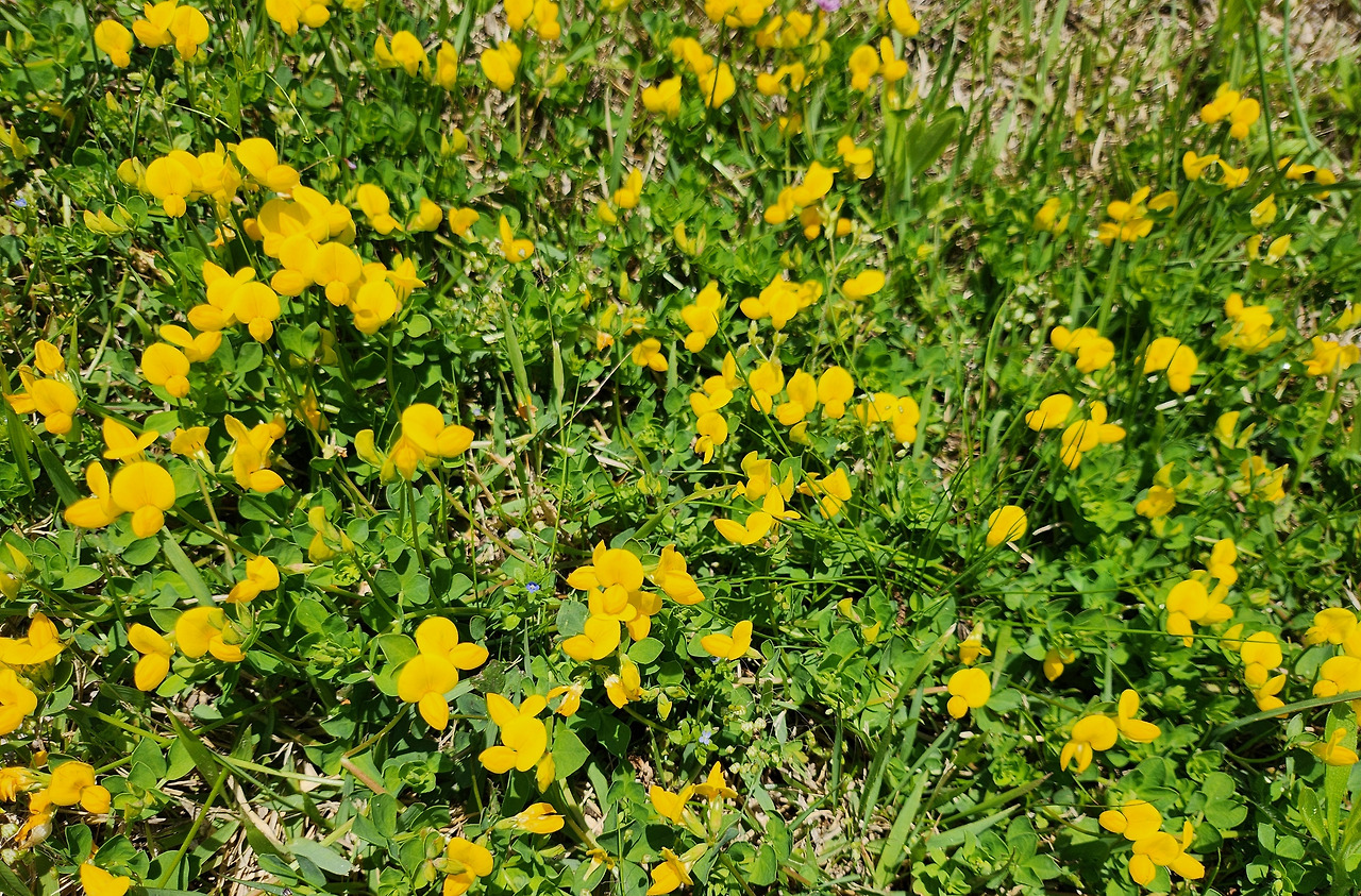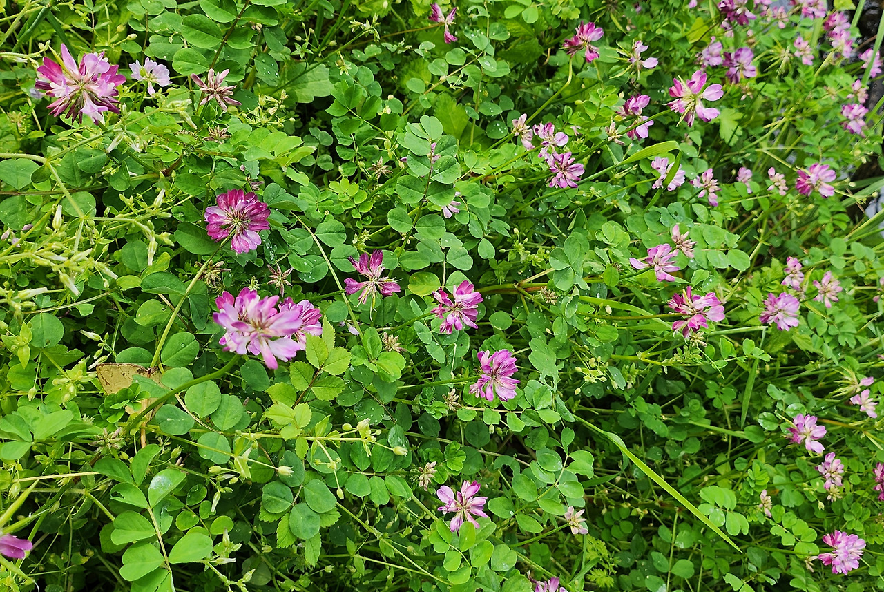 땅바닥에 바짝 깔린 앉은뱅이 꿀꽃 금창초, 나비 모양의 붉은 보랏빛 살갈퀴꽃은 또 얼마나 무성한지요.
