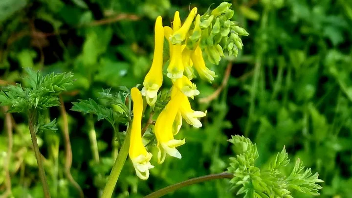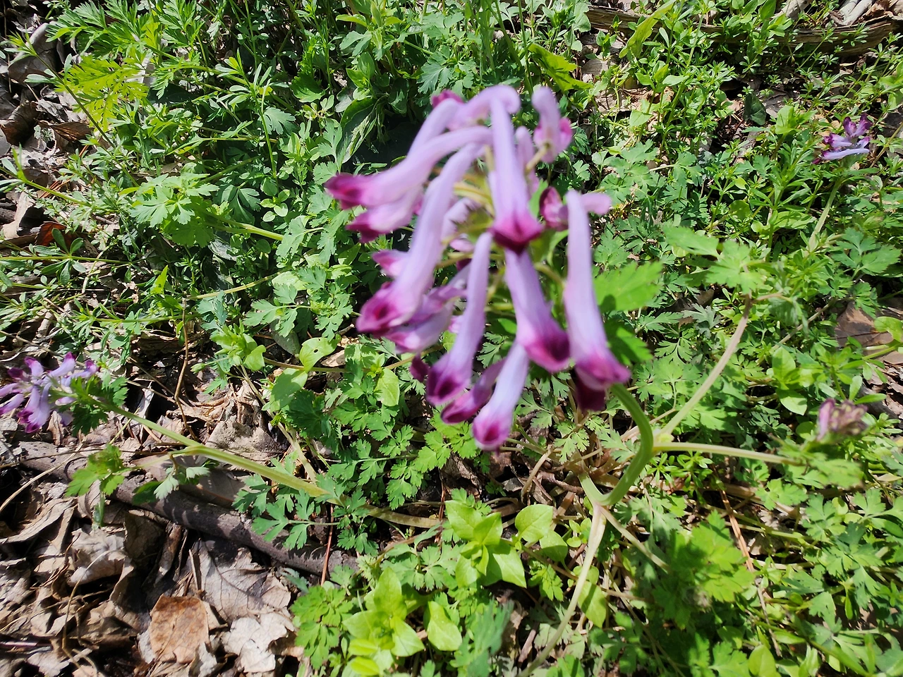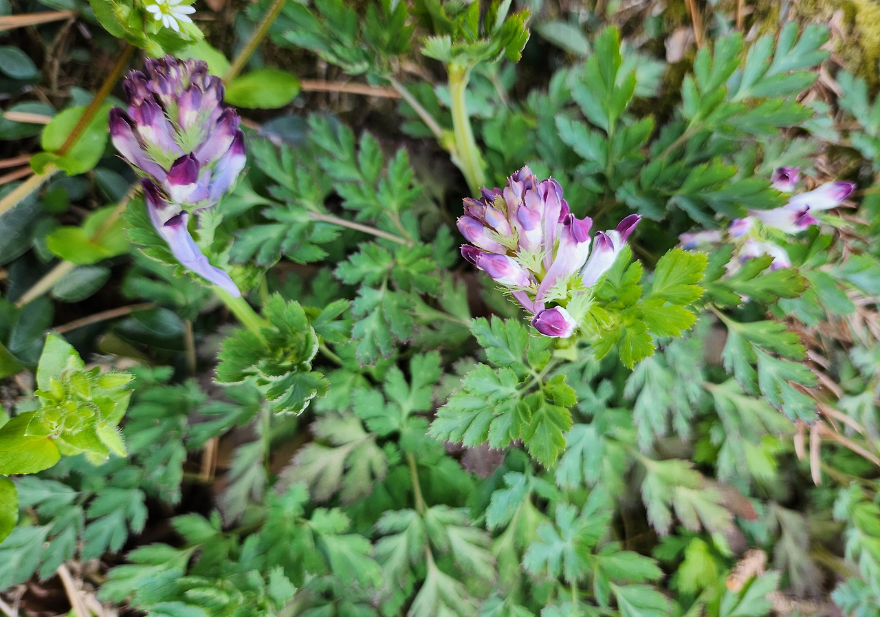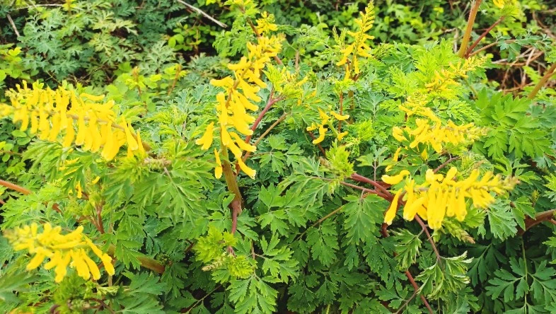 노란색과 연자색 그 꽃은 꽃모양이 꽃대를 기준으로 양쪽으로 피면 괴불주머니, 꽃대의 한쪽에만 꽃이 피면 현호색이라네요.