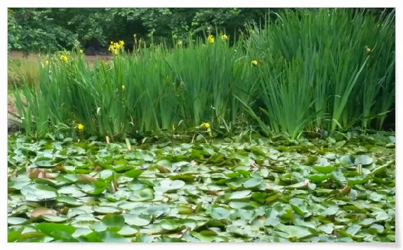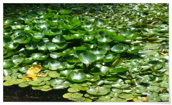 수련이기엔 잎새 아주 자그마한 물풀들, 이름 모를 부평초 연못을 휘덮여 있다.
