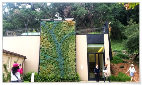 아트 갤러리답게 전면 담벼락에는 식물을 일일이 작은 분에 식재해 꾸민 나무 모형 커다란 액자를 걸어놓았다,