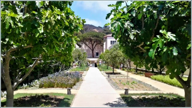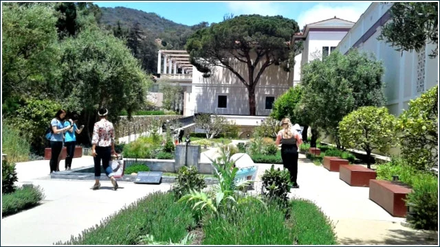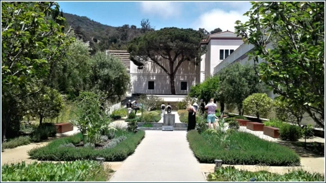 Getty Villa는 말리부 바다가 내려다보이는 Pacific Coast Highway 옆 숲 속에 깃들어 있다.