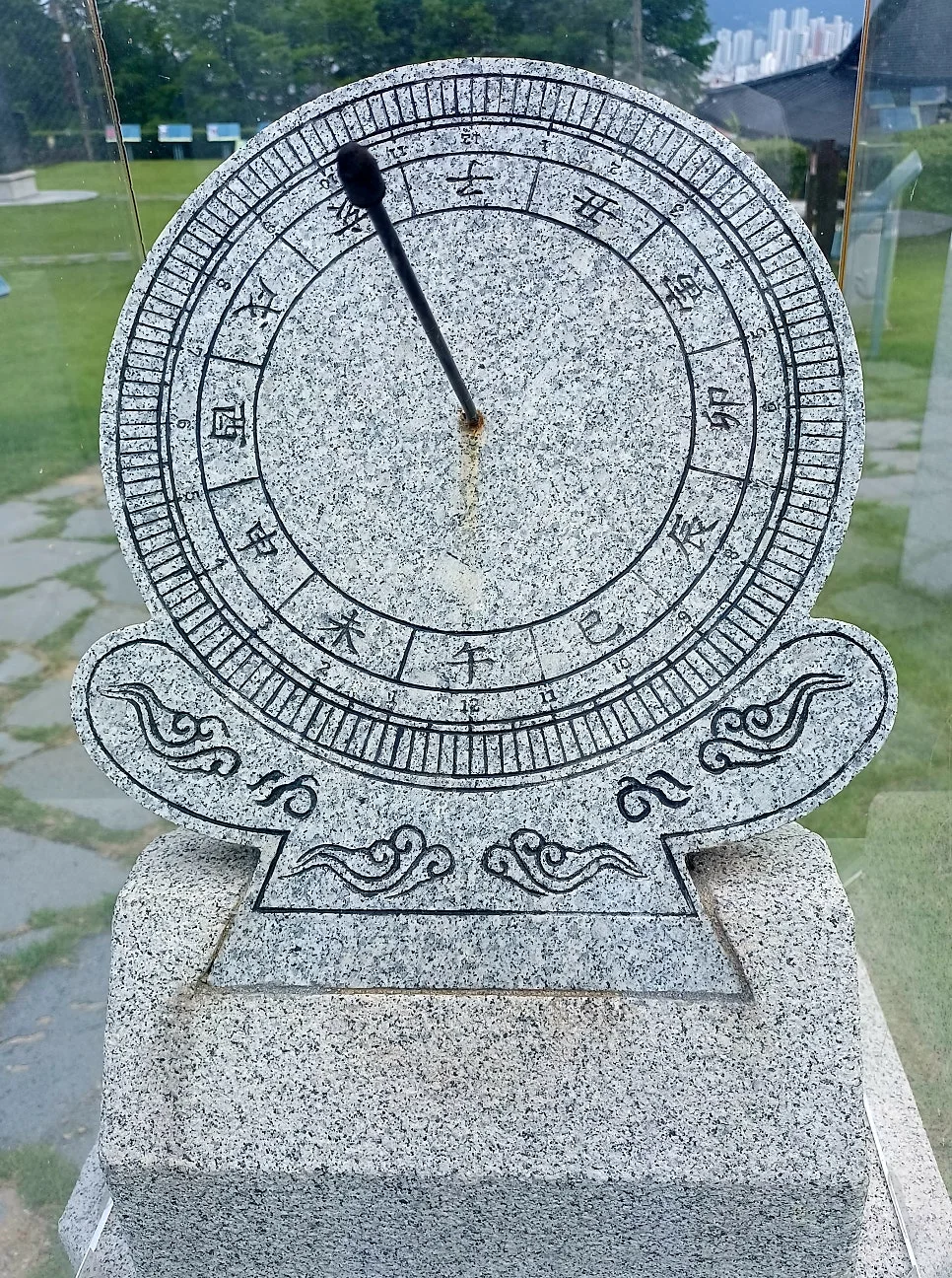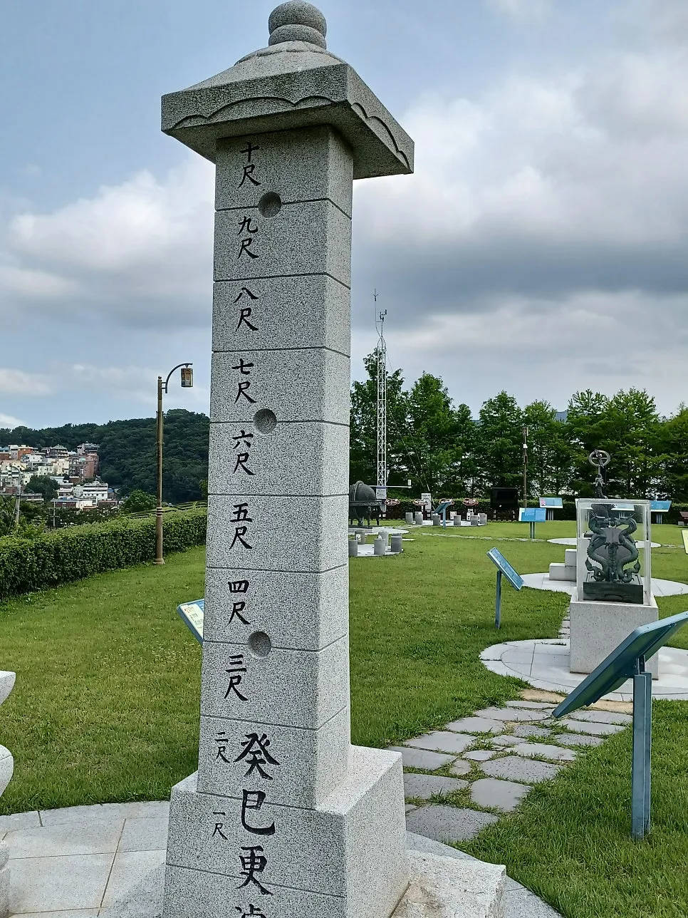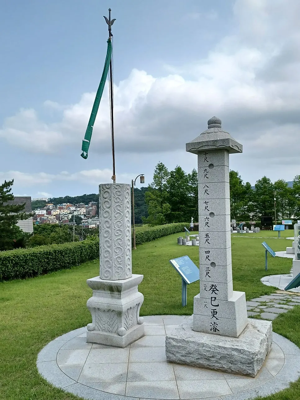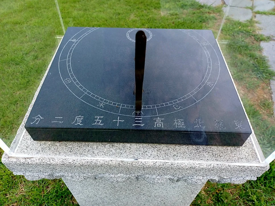 석조로 만든 수표로 하천 수위를 재는 측정계/ 양측은 동양 해시계와 서양 해시계