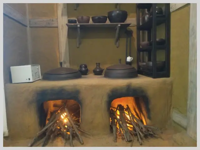 7. 소성 (옹기 굽기) - 가마 안에 옹기를 잘 재어 넣은 후 장작을 넣고 불을 지펴 200~1200도로 서서히 온도를 올려서 며칠씩 구운 다음 충분히 식힌다.
