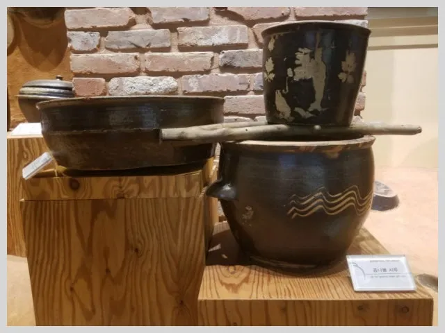 불 지핀 아궁이가 있는 친근한 황토 부뚜막 위엔 과거 우리가 쓰던 주방용품들이 놓여 있었다. 향수 어린 옹기 제품들, 엄마와 고향이 동시에 겹쳐지는 단어가 항아리다. 어릴 적에 보았던 오지 자배기며 아주 큰 물독이며 간수 단지, 곤쟁이젓 통, 양념 단지, 소줏고리, 오줌장군, 콩나물시루는 낯익었다. 옹기로 만든 벌통, 돗자리 엮을 때 쓰는 고드랫돌, 떡살도 오랜만의 조우라 퍽 반가웠다. 황토를 넣은 항아리에 물을 가득 부어 우러난 미네랄수를 받아 약으로 쓰는 '귀때 지장수 항아리'는 보기도 첨이다. 또한 주변에는 옹기 파편이 무수한데, 불에서 꺼낸 완성품에 조그만 흠집이 있어도 도공들은 가차 없이 항아리를 내던져버린다. 그렇게 산산이 부서져 조각 진 흔적들이다.