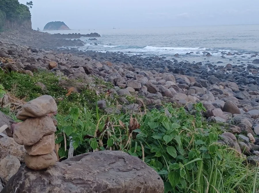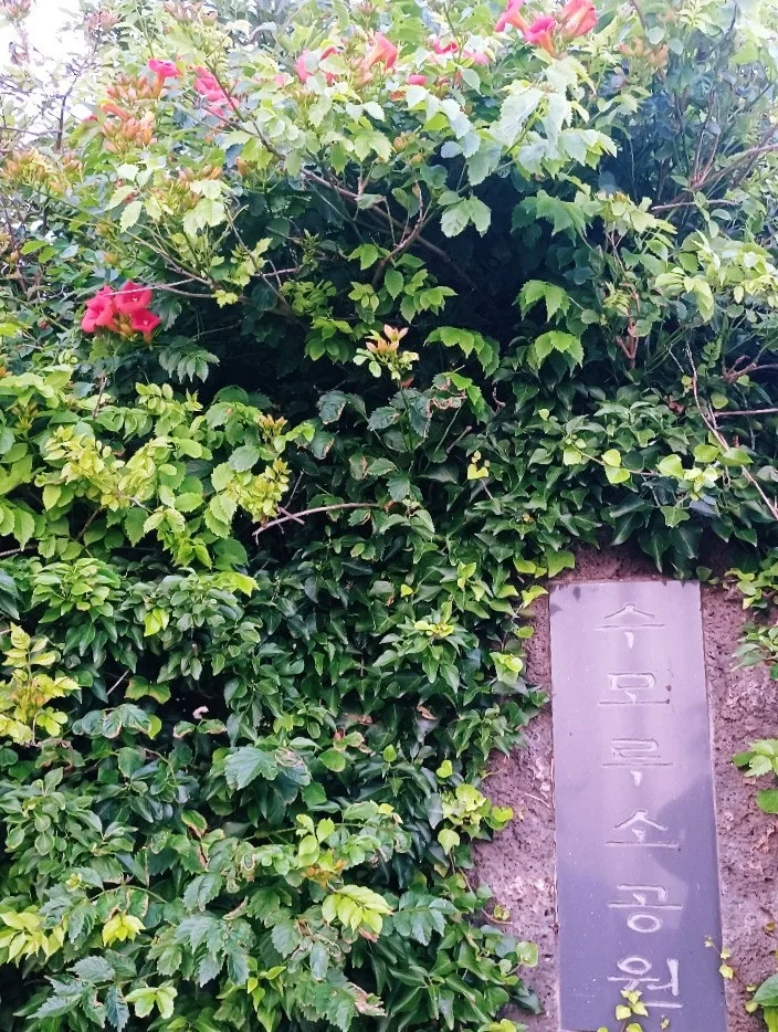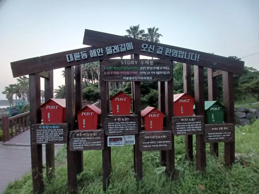 예쁜 빨간 다리가 걸려있고 스토리 우체통이 선 대륜동 해안 올레길, 이 길 오가다 쉬어가던 장소다.