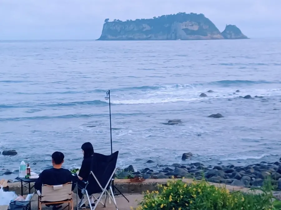 아빠는 낚시를 즐기고 도란도란 모녀는 바다를 향해 앉아있다.